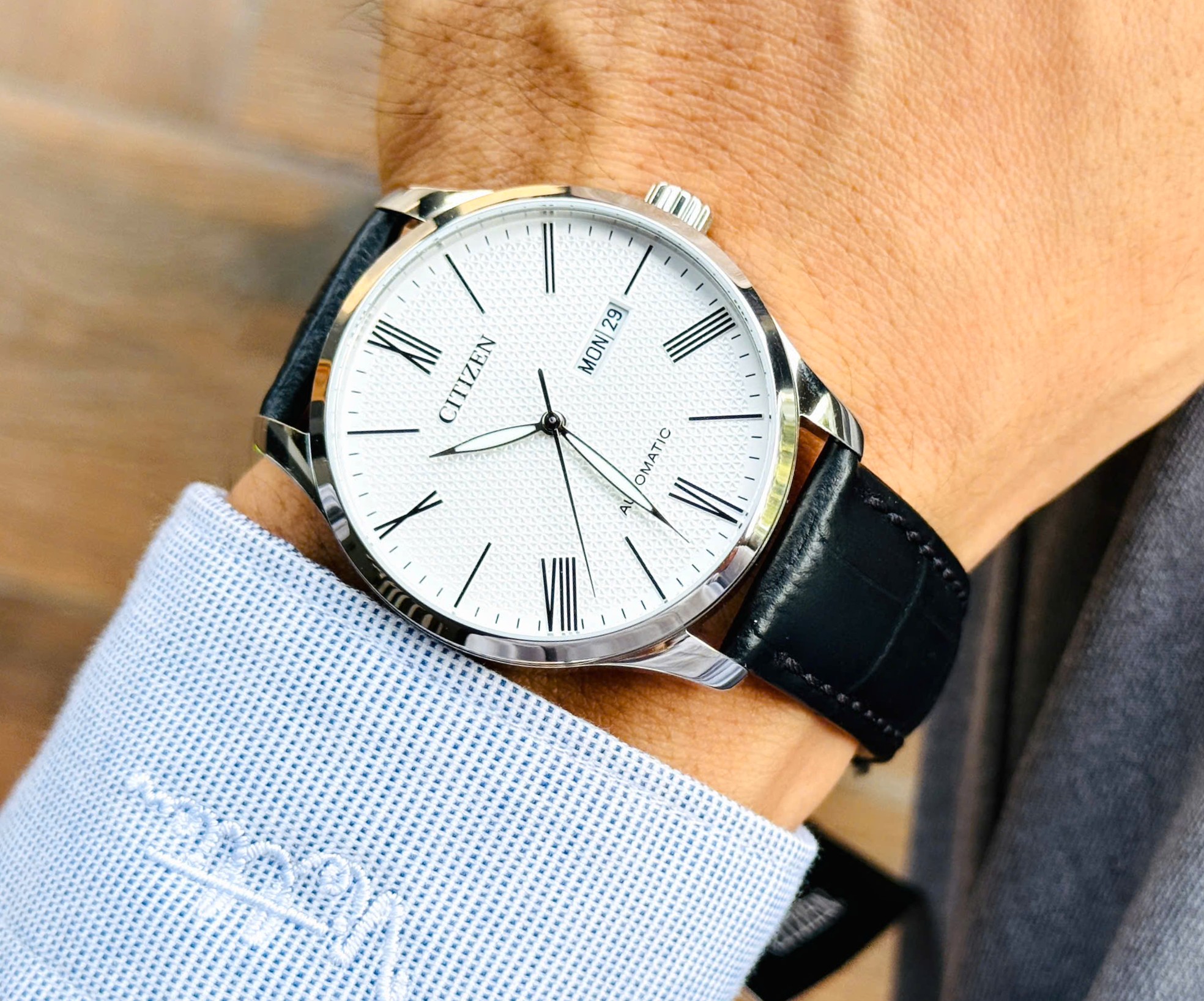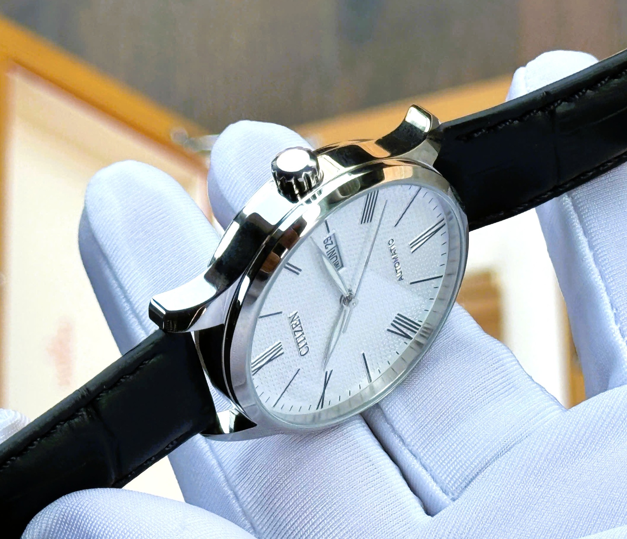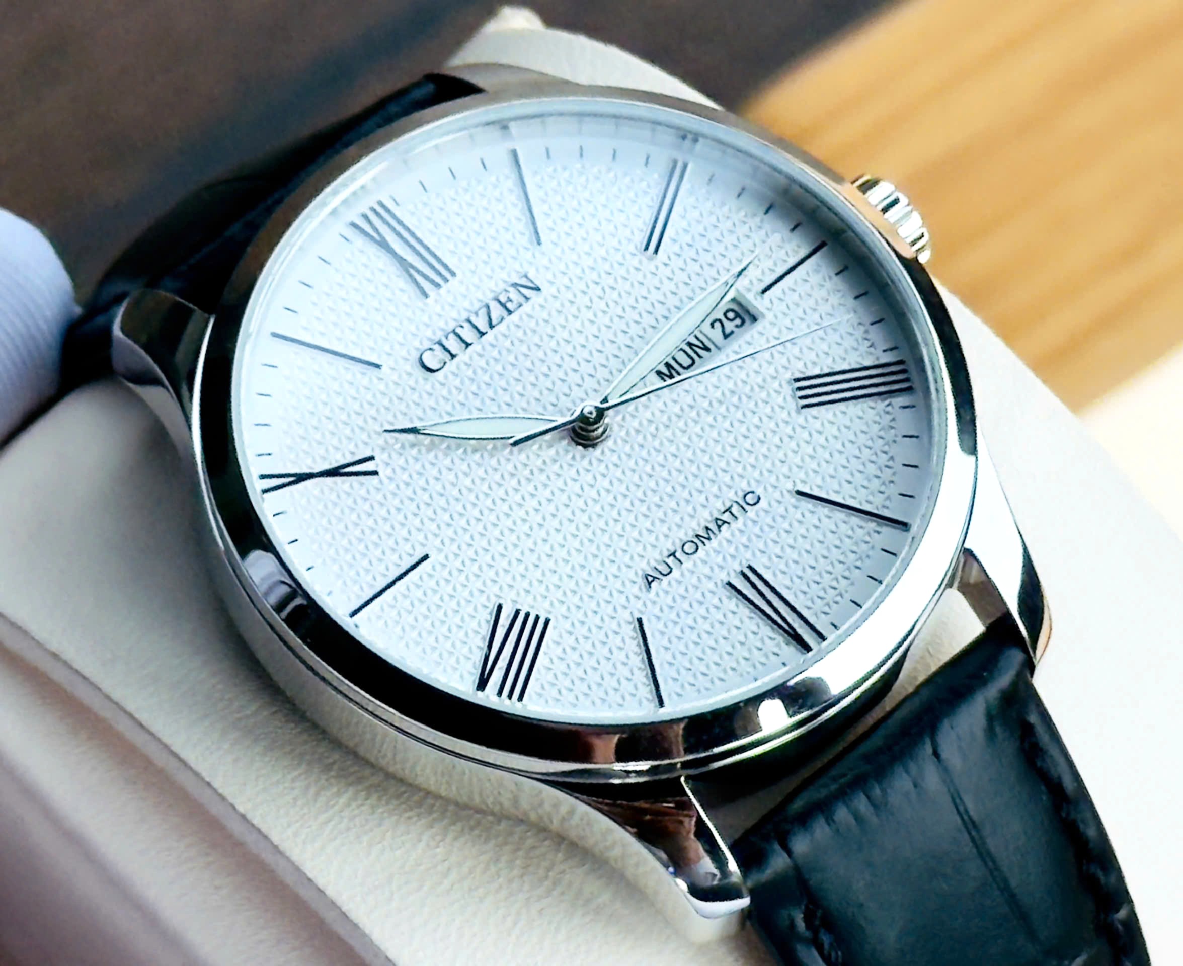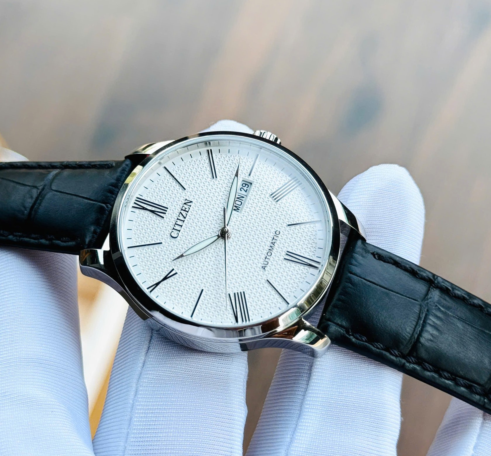Đồng hồ cơ dưới 5 triệu ĐỒNG HỒ CITIZEN NAM NH8350-08A – AUTOMATIC – DÂY DA – 5ATM – 40MM vỏ inox đúc nguyên khối, kính khoáng cứng chống va đập, kiểu dáng đồng hồ thời trang với phong cách lịch lãm và mạnh mẽ, mặt đồng hồ màu kem kết hợp số la mã sang trọng thể hiện đẳng cấp. 3 kim quay hiển thị giờ, phút, giây, 1 lịch ngày và 1 lịch thứ.