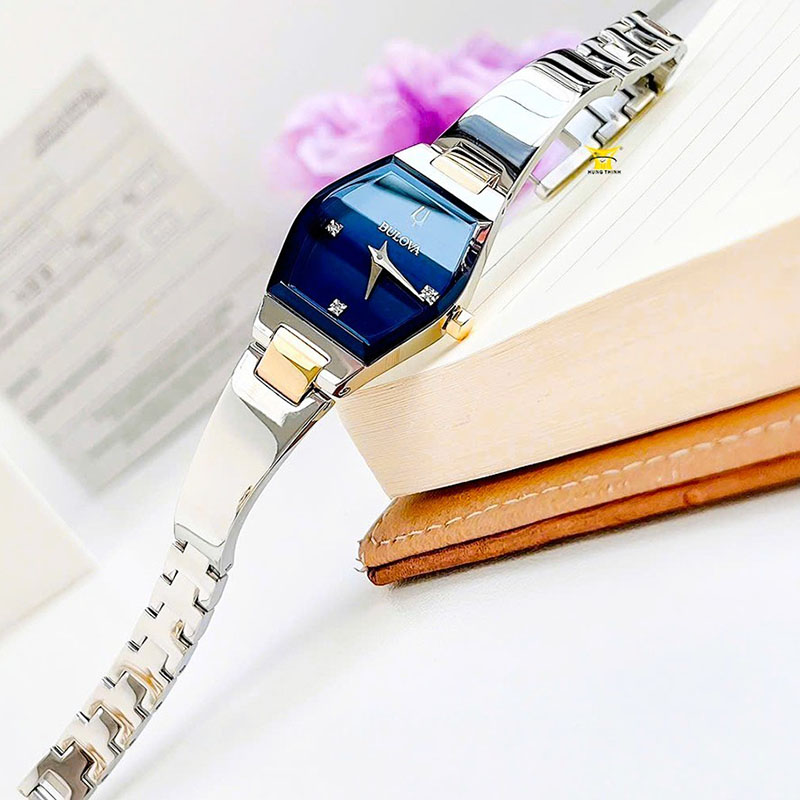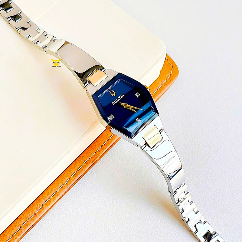 Mặt số màu xanh dương, đính 3 viên kim cương. |