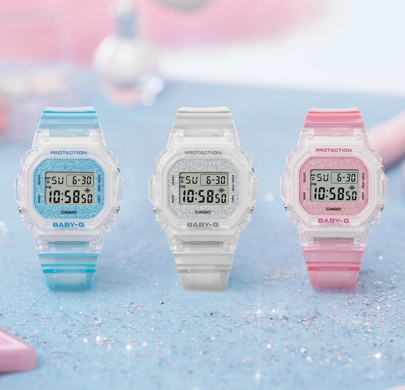 ĐỒNG HỒ CASIO BABY-G NỮ – BGD-565GC-2DR – QUARTZ (PIN) – DÂY NHỰA – 10ATM – 38MM Là thiết kế nổi tiếng dành riêng cho các cô nàng năng động. Điểm nhấn nổi bật là dáng hình vuông mặt số kim tuyến lấp lánh, kết hợp dây đeo bán trong suốt thời trang, mang đến vẻ ngoài trẻ trung và sành điệu. Đi kèm với các chức năng như báo thức, giờ thể thao, đèn LED vv… Đặc biệt độ chống nước lên đến 10ATM (100M) thoải cái hoạt động các môn thể thao dưới nước như bơi lội, moto nước, lướt sóng vv…