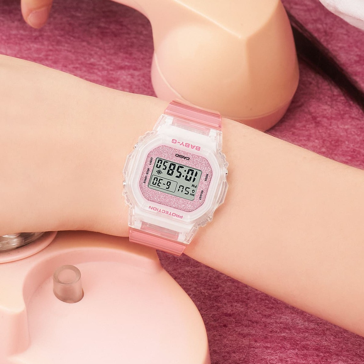 ĐỒNG HỒ CASIO BABY-G NỮ – BGD-565GC-4DR – QUARTZ (PIN) – DÂY NHỰA – 10ATM – 38MM Là thiết kế nổi tiếng dành riêng cho các cô nàng năng động. Điểm nhấn nổi bật là dáng hình vuông mặt số kim tuyến lấp lánh, kết hợp dây đeo bán trong suốt thời trang, mang đến vẻ ngoài trẻ trung và sành điệu. Đi kèm với các chức năng như báo thức, giờ thể thao, đèn LED vv… Đặc biệt độ chống nước lên đến 10ATM (100M) thoải cái hoạt động các môn thể thao dưới nước như bơi lội, moto nước, lướt sóng vv…