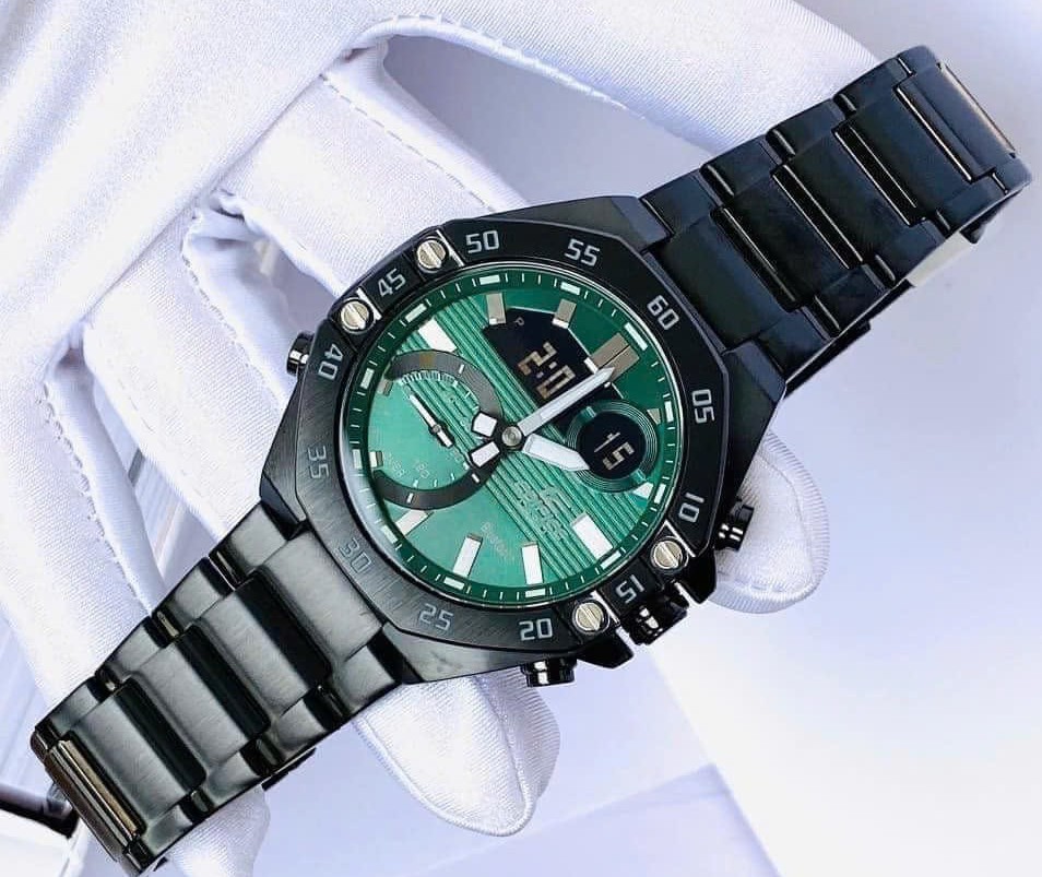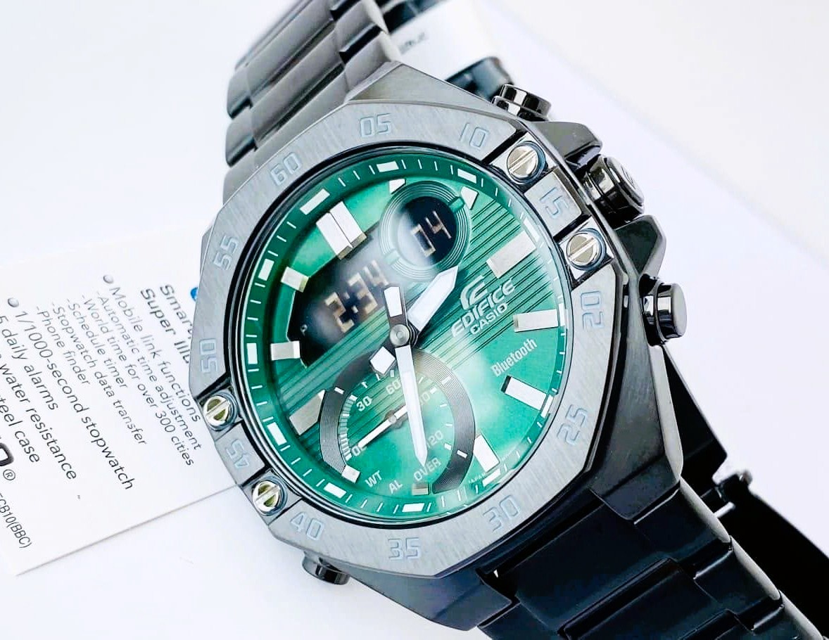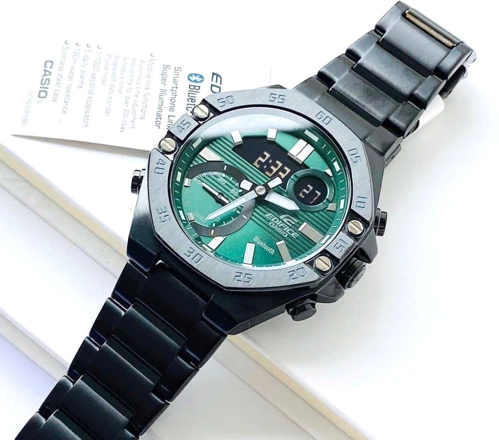 ĐỒNG HỒ CASIO EDIFICE NAM ECB-10DC-3ADF – BLUETOOTH- DÂY KIM LOẠI – 10ATM – 48.5MM là thương hiệu đồng hồ chính hãng từ Nhật Bản đã có mặt lâu đời tại thị trường Việt Nam. Thiết kế với mặt màu xanh đậm kết hợp với dây inox mạ full màu đen theo công nghệ cao cấp PVD không phai thật cá tính và năng động. Sử dụng bộ máy kỹ thuật số kết hợp cùng với kim độc đáo, chế độ Mobile link (Kết nối không dây sử dụng Bluetooth®) sử dụng ứng dụng EDIFICE Connected kết nối với điện thoại thông minh. Độ chống nước lên đến 100M thoải mái sử dụng để bơi lội, hoạt động thể thao dưới nước vv…