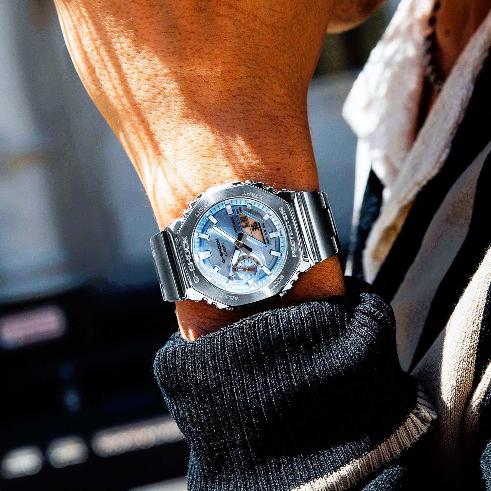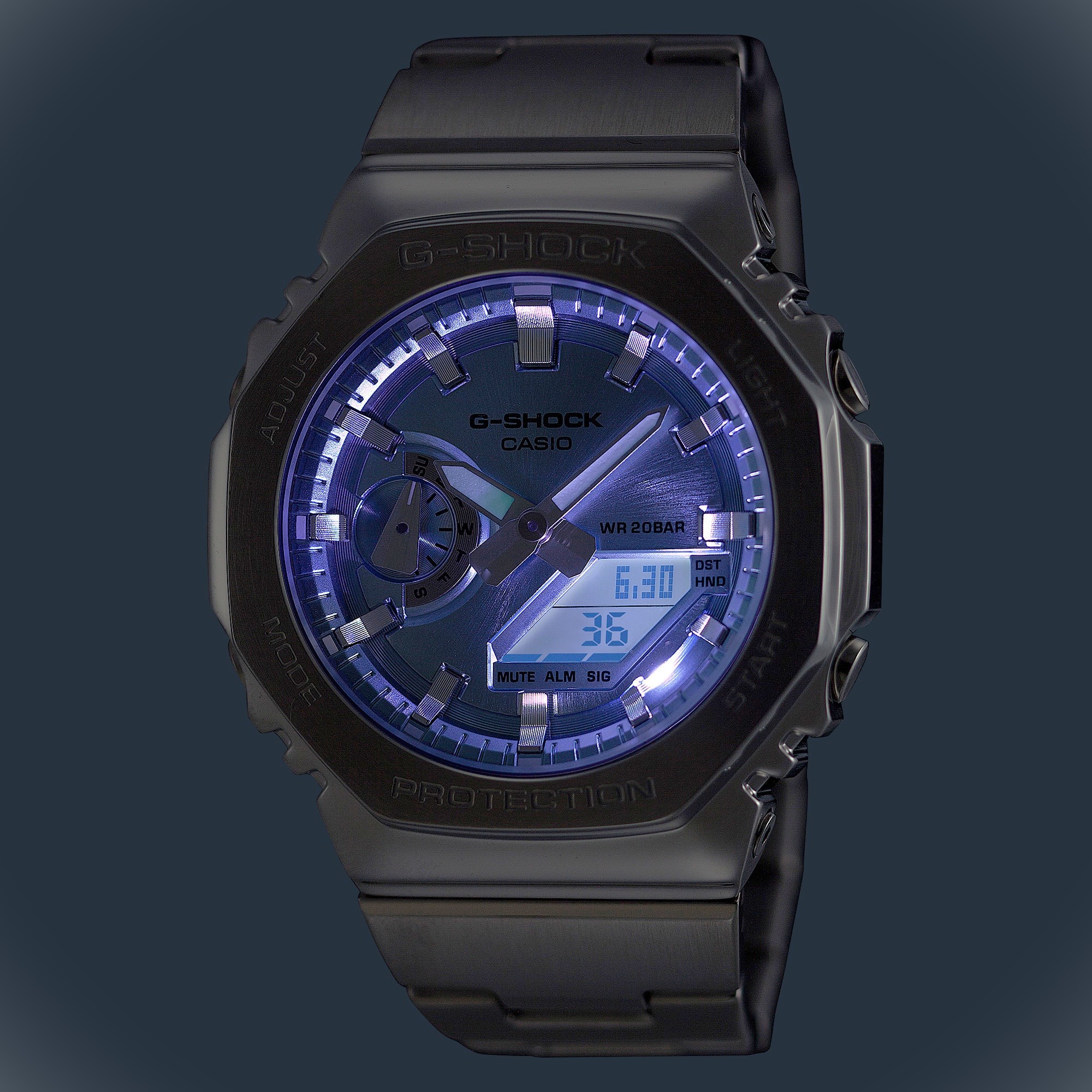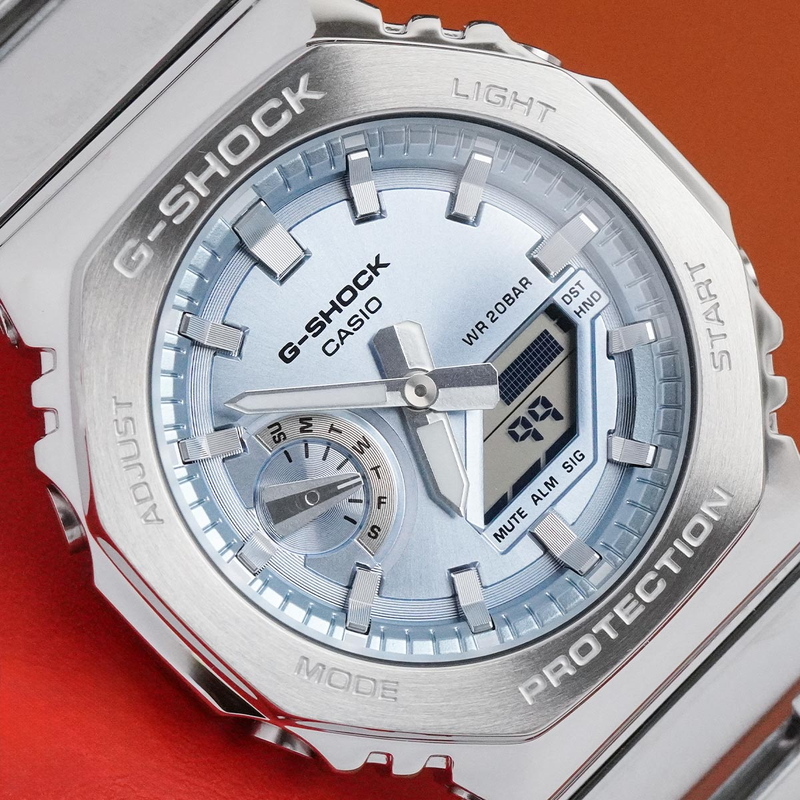Viền đồng hồ có hình bát giác bằng thép không gỉ, được chế tác kỹ lưỡng và đánh bóng tinh xảo. Tạo nên một thiết kế vừa tinh tế, vừa bền bỉ. Vỏ đồng hồ được làm từ nhựa gia cố bằng sợi thủy tinh, mang lại độ mỏng chỉ 11.8 mm, khiến nó trở thành một trong những mẫu G-SHOCK kim kết hợp số mỏng nhất hiện nay.
