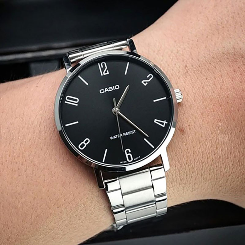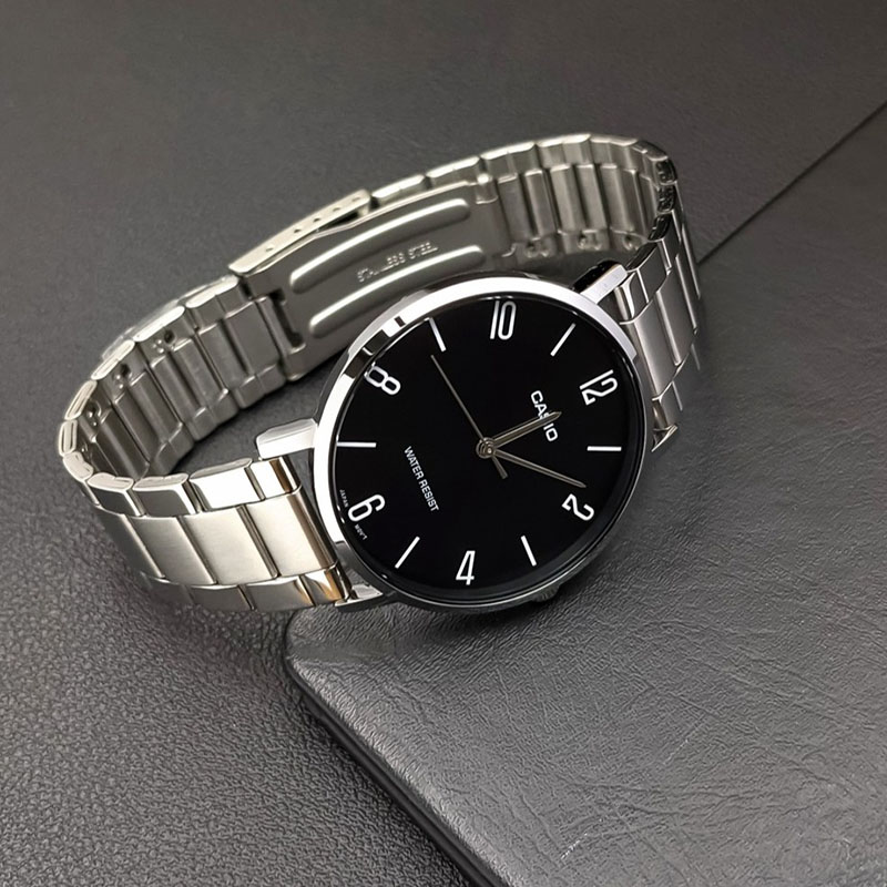 ĐỒNG HỒ CASIO NAM MTP-VT01D-1B2UDF – QUARTZ – DÂY KIM LOẠI – 40MM chính hãng. Thiết kế thời trang trẻ trung, đồng hồ 3 kim truyền thống, vạch chia giờ số học trò màu trắng nổi bật trên nền đen giúp người dùng dễ dàng xem giờ.