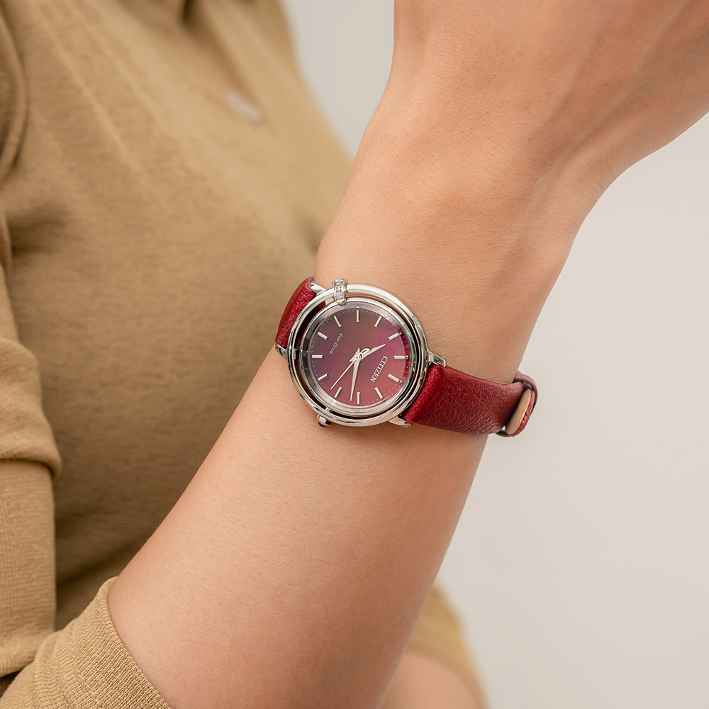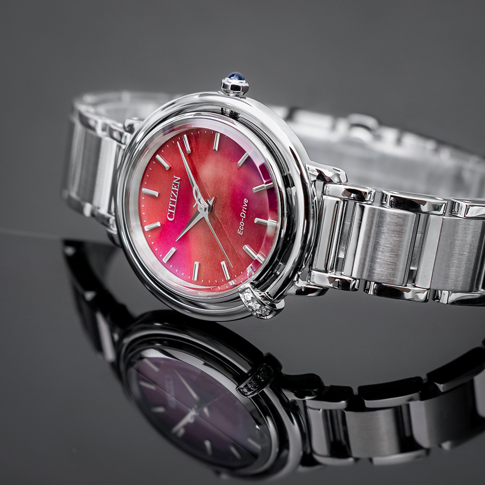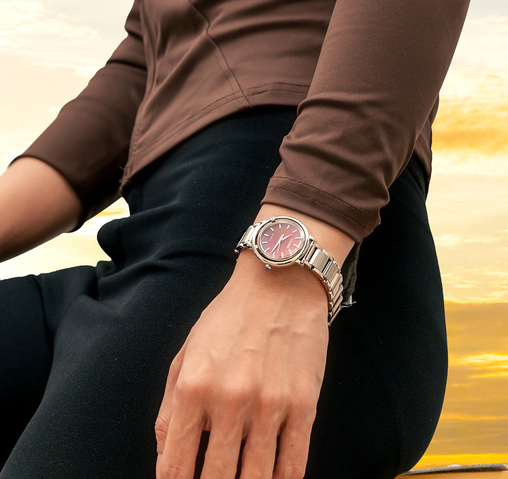 ĐỒNG HỒ CITIZEN – L ARCLY – ECO-DRIVE – NỮ – KÍNH SAPPHIRE – 5ATM – 31.2MM – EM1090-78X gây ấn tượng trong mắt phái đẹp ngay từ cái nhìn đầu tiên với vẻ ngoài mang phong cách thiết kế đầy màu sắc, là sự kết hợp giữa một món trang sức đắt tiền và một cỗ máy thời gian mạnh mẽ. Sử dụng bộ máy với công nghệ pin năng lượng hấp thụ ánh sáng (công nghệ Eco-Drive) độc quyền từ hãng đồng hồ CITIZEN chính hãng Nhật Bản không cần phải thay pin trong suốt quá trình sử dụng. Độ chống nước 50M (5ATM). Điểm nhấn của chiếc đồng hồ chính hãng Citizen EM1090-78X chính là dây đeo có thể thay đổi từ dây kim loại qua dây da hoặc ngược lại 1 cách nhanh chóng và đơn giản, mua 1 mà được 2.