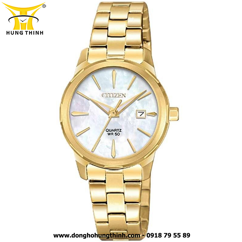 ĐỒNG HỒ CITIZEN NỮ DÂY KIM LOẠI 3 KIM EU6072-56D Kiểu dáng đồng hồ thời trang, thiết kế đơn giản, mặt số xà cừ sang trọng và cá tính, độ chống nước 50M. Đồng hồ 3 kim xem giờ truyền thống và 1 lịch ngày.