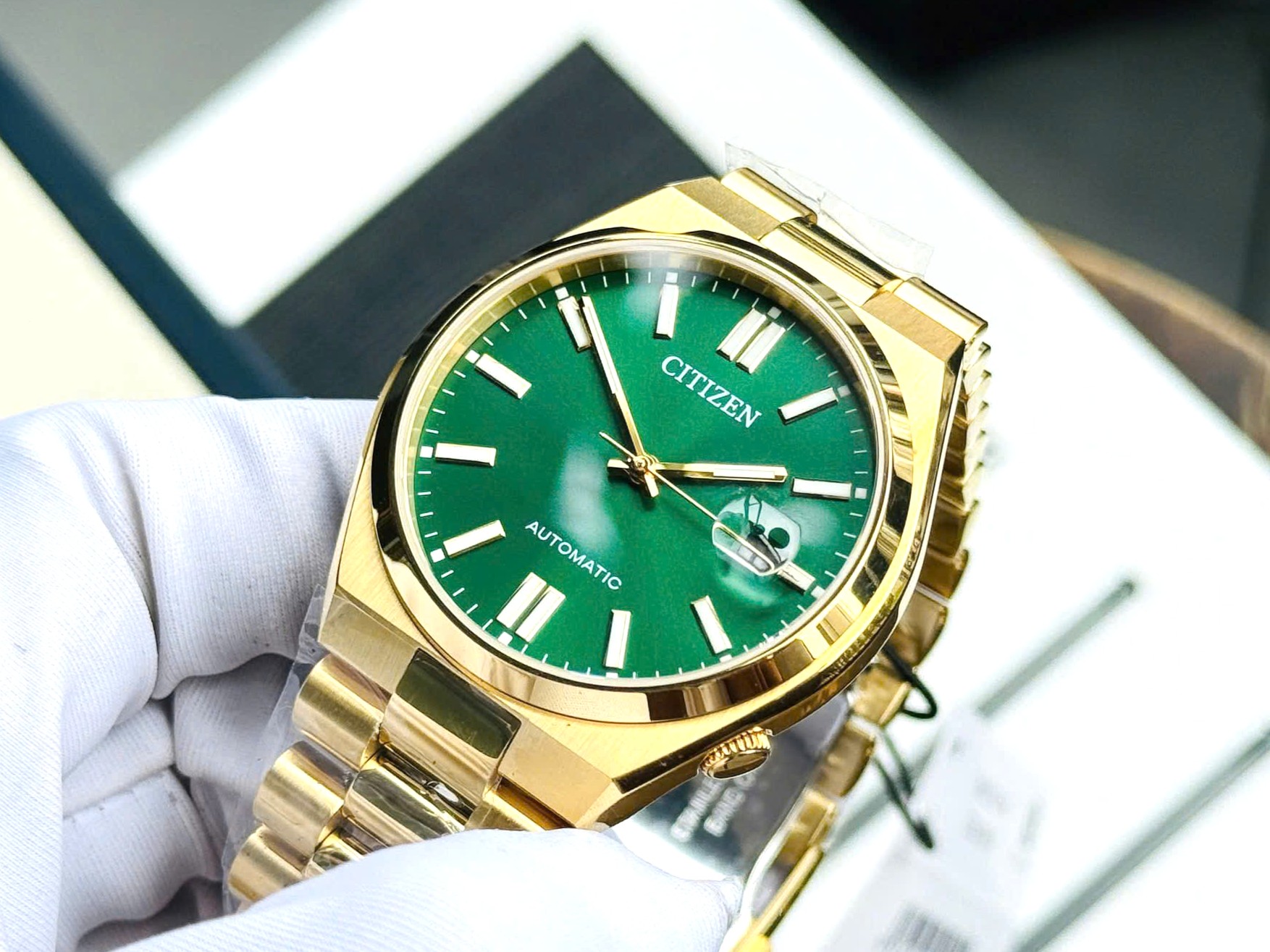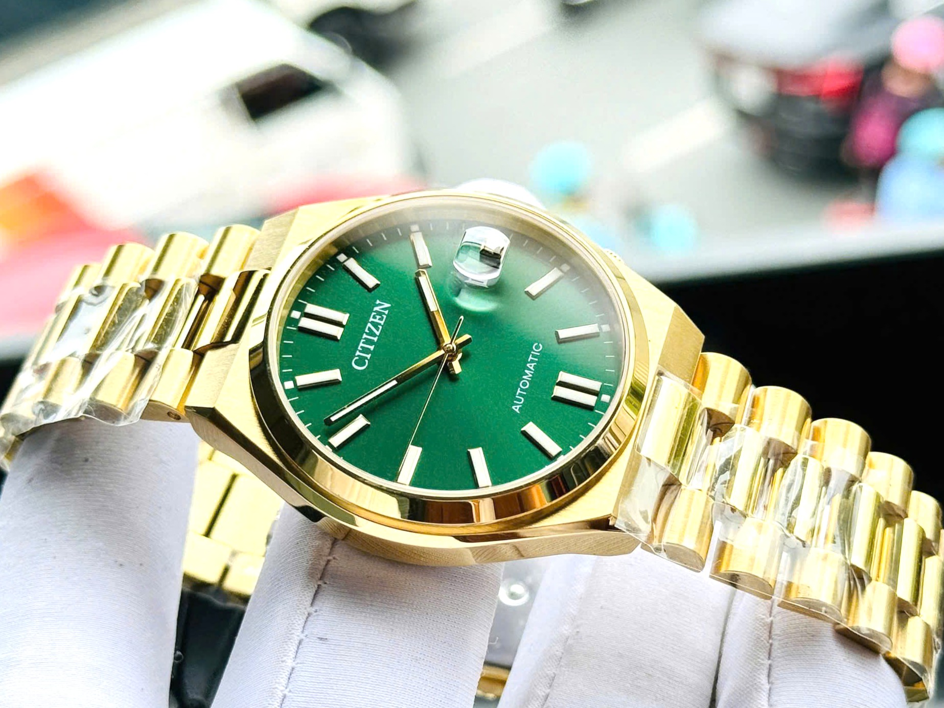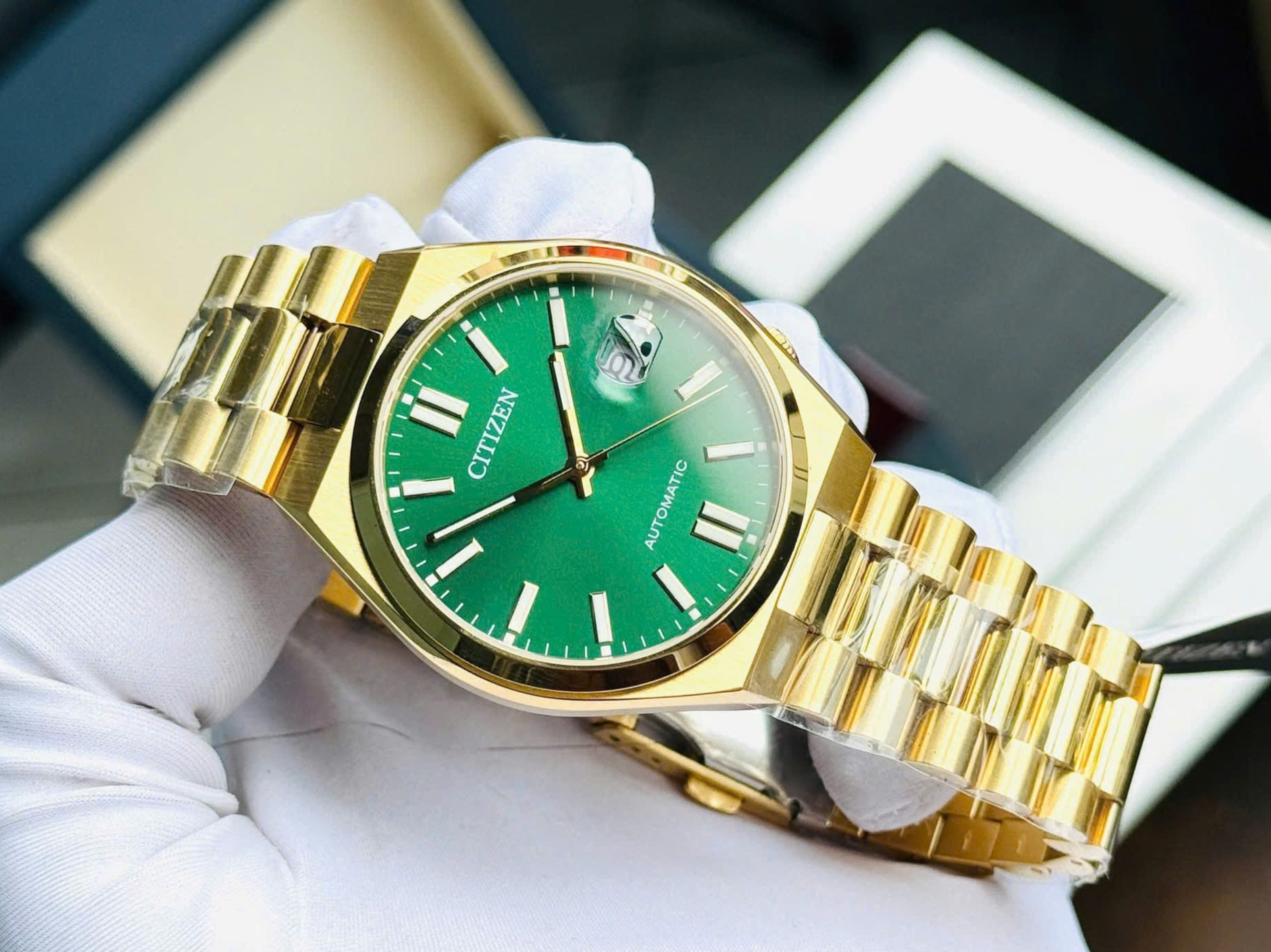 ĐỒNG HỒ CITIZEN TSUYOSA MECHANICAL – NAM – TỰ ĐỘNG (AUTOMATIC) – DÂY KIM LOẠI – 40MM – NJ0152-51X: Kiểu dáng đồng hồ thời trang mang phong cách hiện đại, thiết kế trẻ trung sang trọng, với mặt màu xanh lá trên nền dây và vỏ mạ màu vàng theo công nghệ PVD không phai. Kính Sapphire chống trầy xước kết hợp với lúp tại vị trí 3h giúp xem ngày được dễ dàng hơn. Đồng hồ 3 kim xem giờ truyền thống, độ chống nước 50M.