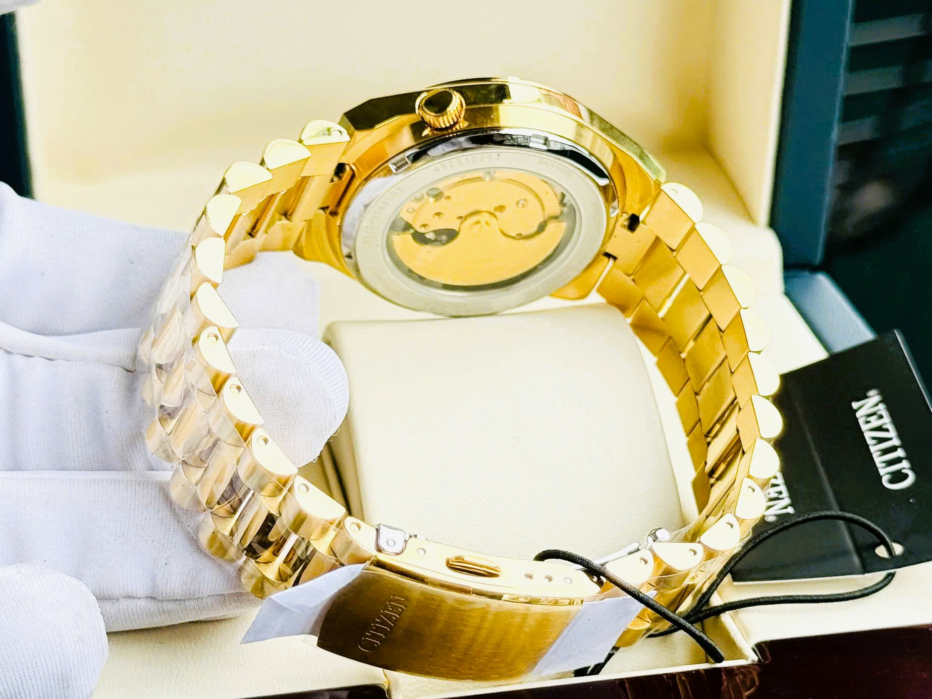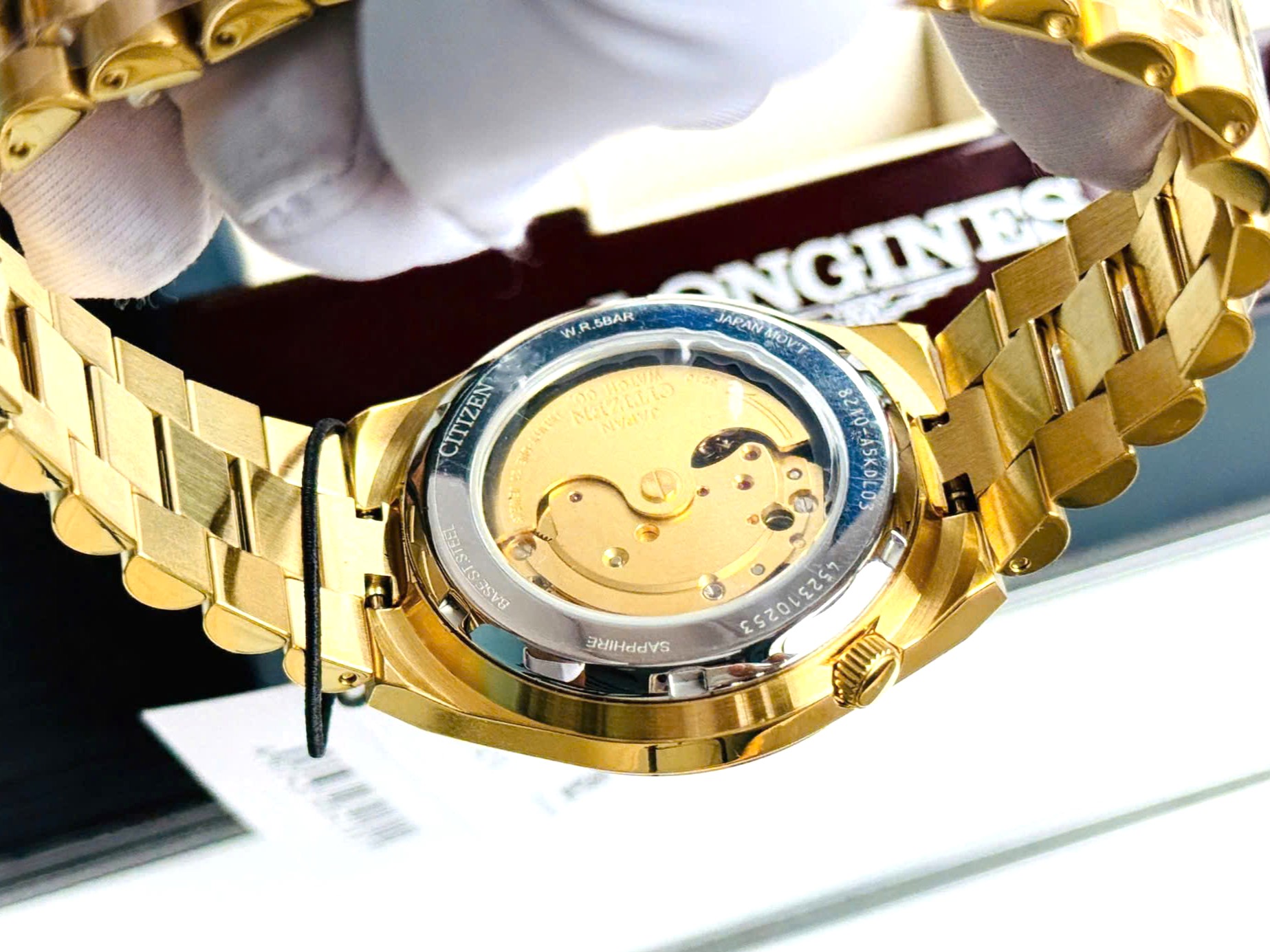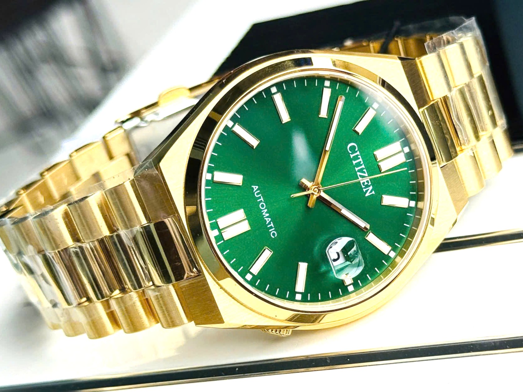 ĐỒNG HỒ CITIZEN TSUYOSA MECHANICAL – NAM – TỰ ĐỘNG (AUTOMATIC) – DÂY KIM LOẠI – 40MM – NJ0152-51X: Kiểu dáng đồng hồ thời trang mang phong cách hiện đại, thiết kế trẻ trung sang trọng, với mặt màu xanh lá trên nền dây và vỏ mạ màu vàng theo công nghệ PVD không phai. Kính Sapphire chống trầy xước kết hợp với lúp tại vị trí 3h giúp xem ngày được dễ dàng hơn. Đồng hồ 3 kim xem giờ truyền thống, độ chống nước 50M.