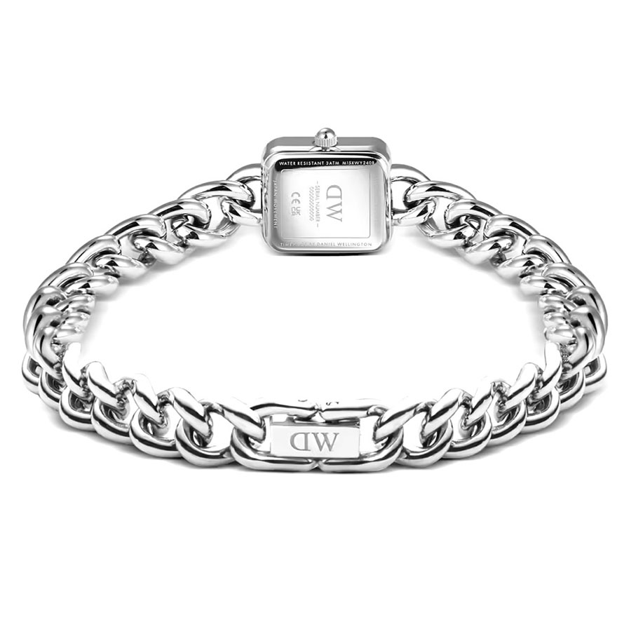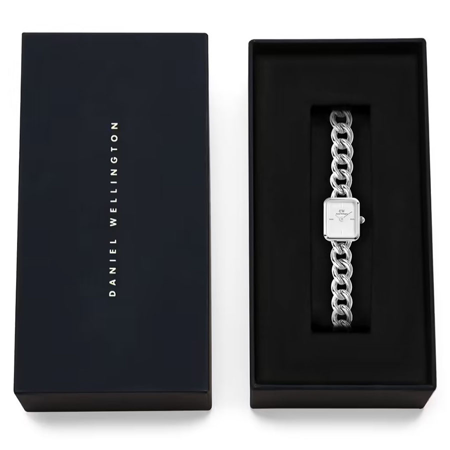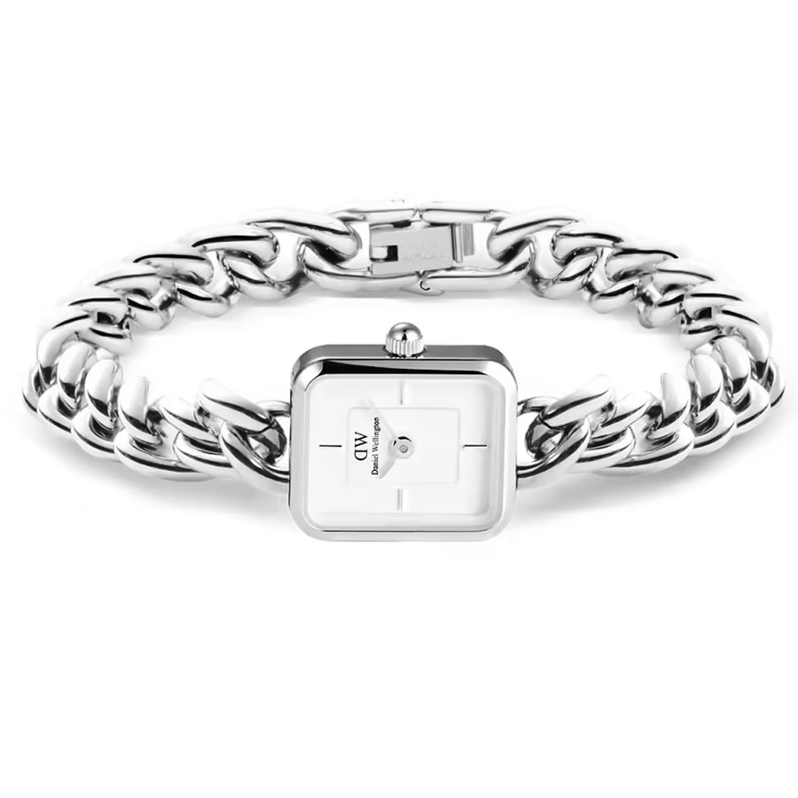 ĐỒNG HỒ DANIEL WELLINGTON (DW) Quadro Mini NỮ DW00100834 – QUART (PIN) – DÂY KIM LOẠI – 15.4×18.2MM chính hãng. Sở hữu mặt hình chữ nhật mới lạ độc đáo, kết hợp giữa mặt số tối giản, dây xích Chain cùng vỏ sắc bạc trắng chủ đạo, tạo nên sự sang trọng, thời trang, tinh tế cho các quý cô. Sử dụng bộ máy quartz chính hãng Nhật Bản rất bền bỉ, thời gian hoạt động của pin có thể lên đến 5 năm.