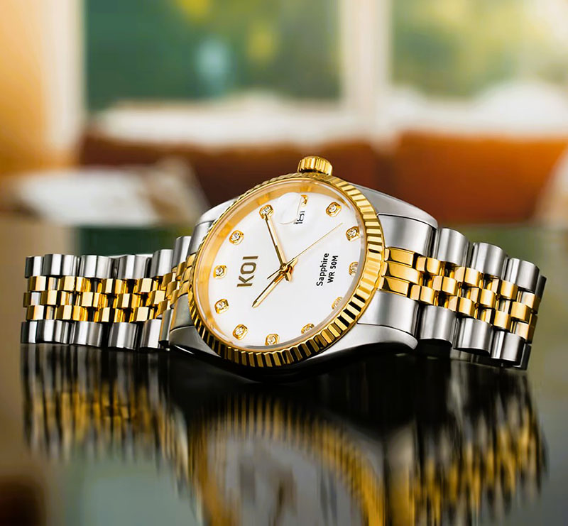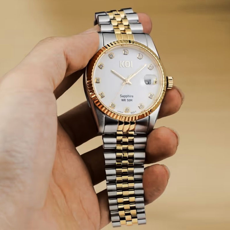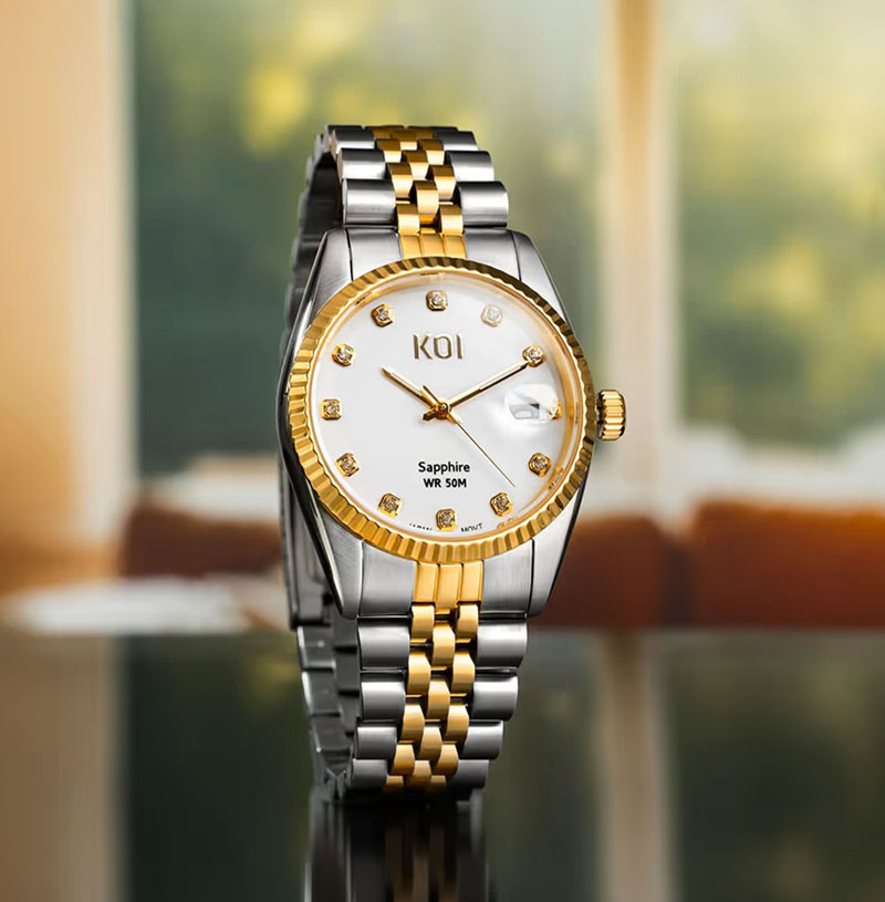 ĐỒNG HỒ KOI NAM K002.403.641.50.01.04 – SWISS QUARTZ – DÂY ĐỜ MI – SAPPHIRE – 5ATM – 38MM Sử dụng bộ máy Ronda Thụy Sỹ chính hãng mang đến độ bền cao và ổn định. Kiểu dáng đồng hồ thời trang với dây kim loại mạ màu vàng đờ mi phối cùng lớp sơn mài ấn tượng trên nền số, viền khứa ren cưa và vạch số được đính đá lấp lánh, sang trọng. Mặt kính sapphire chống trầy xước cùng với tiêu chuẩn chống nước 5ATM đảm bảo mang đến sự an tâm cho người đeo.