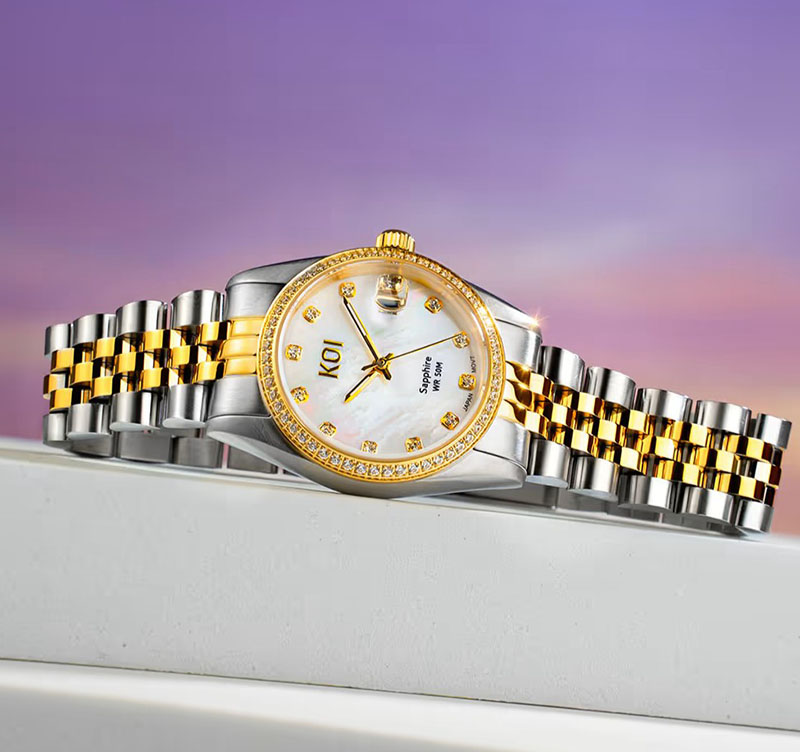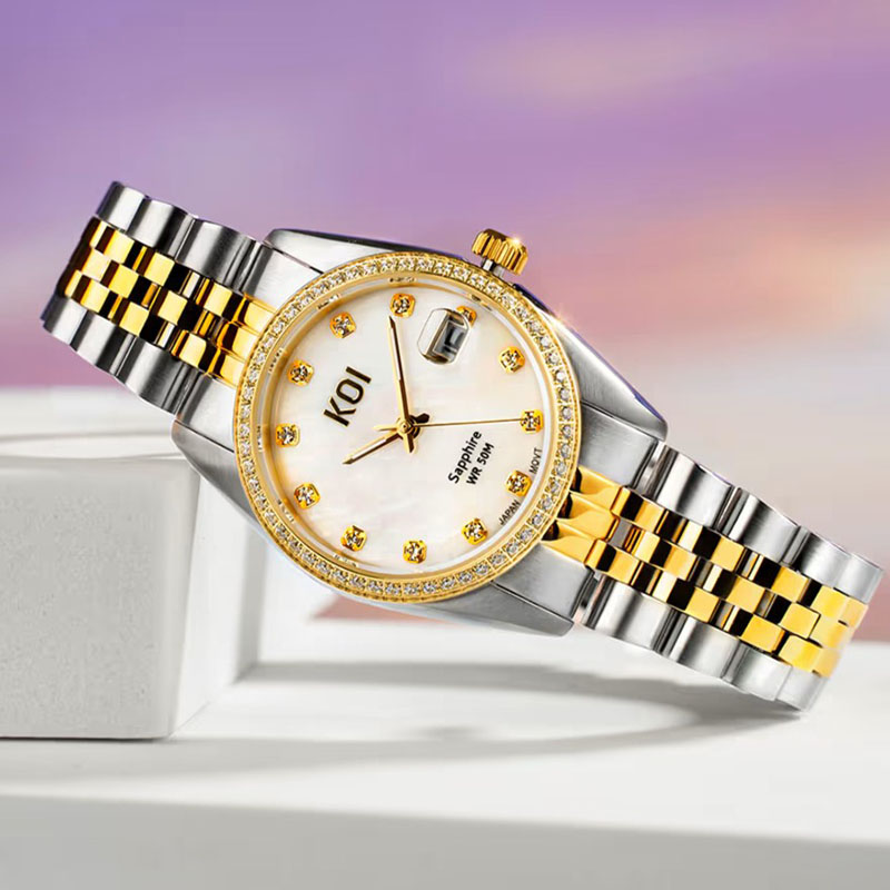 ĐỒNG HỒ KOI NỮ K002.103.641.50.13.04 – SWISS QUARTZ – DÂY ĐỜ MI – SAPPHIRE – 5ATM – 29MM Sử dụng bộ máy Ronda Thụy Sỹ chính hãng mang đến độ bền cao và ổn định. Kiểu dáng đồng hồ thời trang với dây kim loại mạ màu vàng đờ mi phối cùng mặt số khảm xà cừ, viền và vạch số được đính đá lấp lánh, sang trọng. Mặt kính sapphire chống trầy xước cùng với tiêu chuẩn chống nước 5ATM đảm bảo mang đến sự an tâm cho người đeo.