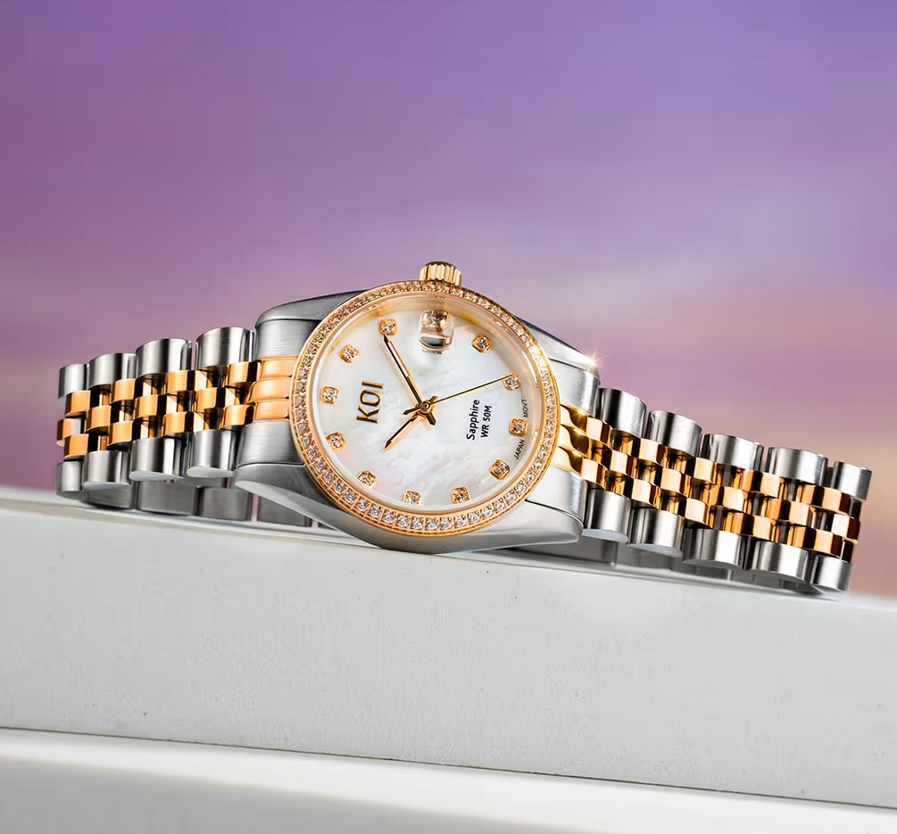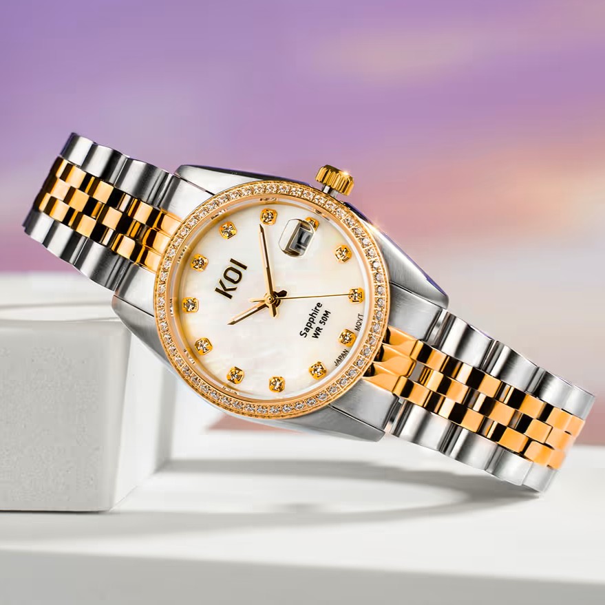 ĐỒNG HỒ KOI NỮ K002.103.641.51.11.04 – SWISS QUARTZ – DÂY ĐỜ MI – SAPPHIRE – 5ATM – 29MM Sử dụng bộ máy Ronda Thụy Sỹ chính hãng mang đến độ bền cao và ổn định. Kiểu dáng đồng hồ thời trang với dây kim loại mạ màu vàng hồng đờ mi phối cùng mặt số khảm xà cừ, viền và vạch số được đính đá lấp lánh, sang trọng. Mặt kính sapphire chống trầy xước cùng với tiêu chuẩn chống nước 5ATM đảm bảo mang đến sự an tâm cho người đeo.