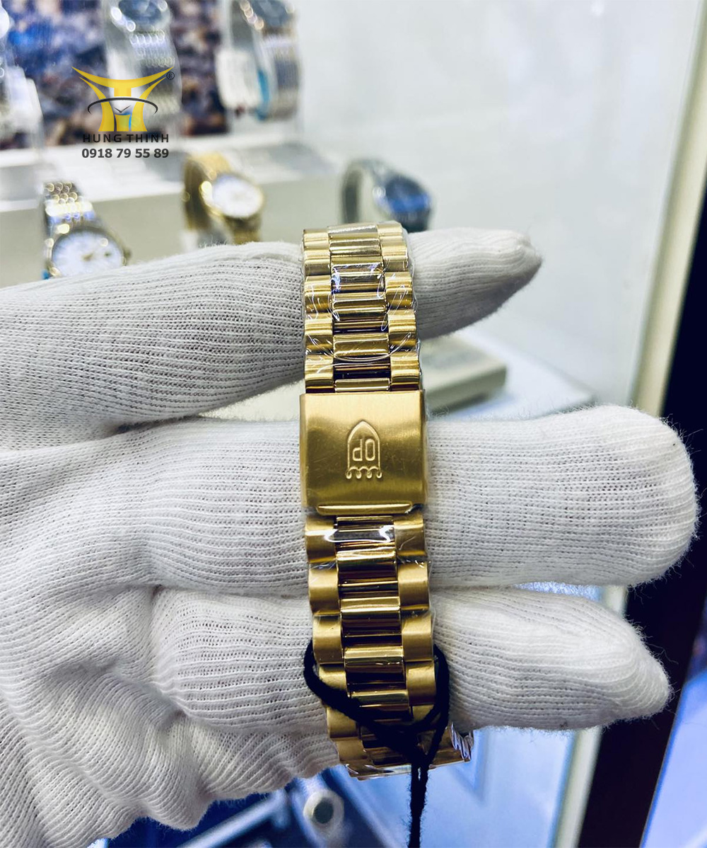 ĐỒNG HỒ OP (OLYM PIANUS) AUTOMATIC (CƠ) NAM – KÍNH SAPPHIRE – 5ATM – 40MM – OP89322AGK-T Kiểu dáng đồng hồ thời trang với thiết kế viền vỏ tạo răng cưa kinh điển lấy cảm hứng từ những thương hiệu đồng hồ đình đám Thụy Sĩ kết hợp cùng mặt số đính 10 viên đá quý tạo cho chiếc đồng hồ sự sang trọng vượt bật. Mặt kính Sapphire nguyên khối chống trầy với phần kính lúp (phóng to) được gắn ngay vị trí hiển thị ngày góc 3h giúp xem ngày 1 cách dễ dàng. Sử dụng bộ máy tự động (Automatic) Nhật Bản chính hãng rất bền bỉ với thời gian trữ cót lên đến 40h.