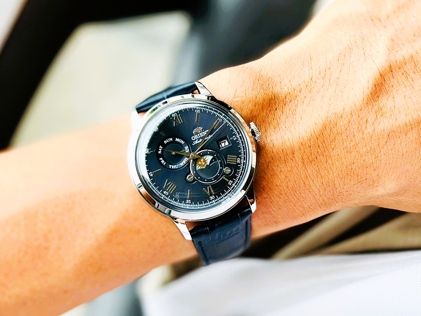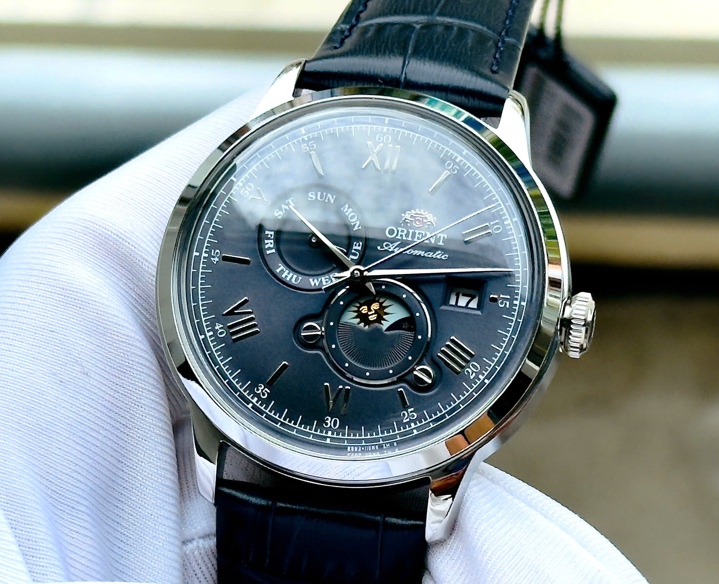 ĐỒNG HỒ ORIENT BAMBINO SUN & MOON NAM RA-AK0806L30B – AUTOMATIC chính hãng. Là chiếc đồng hồ thanh lịch, cổ điển hoàn thiện bởi khung vỏ làm từ inox 316L cao cấp và dây da sang trọng. Cung cấp chuyển động bởi bộ máy tự động in-house F6B24 Nhật Bản chính hãng, với độ tích cót 40 giờ, chức năng lịch ngày, thứ và Sun&Moon độc đáo. Sử dụng mặt số màu xanh dương cuốn hút, cùng mặt kính khoáng cong mang nết cổ điển, độ chống nước 3ATM (30M) cùng độ hoàn thiện tỉ mỉ, sắc nết đã mang đến một chiếc đồng hồ, không chỉ đơn thuần là công cụ đo đếm thời gian, mà còn là biểu tượng của phong cách lịch lãm, đẳng cấp.
