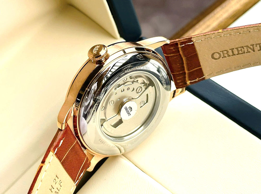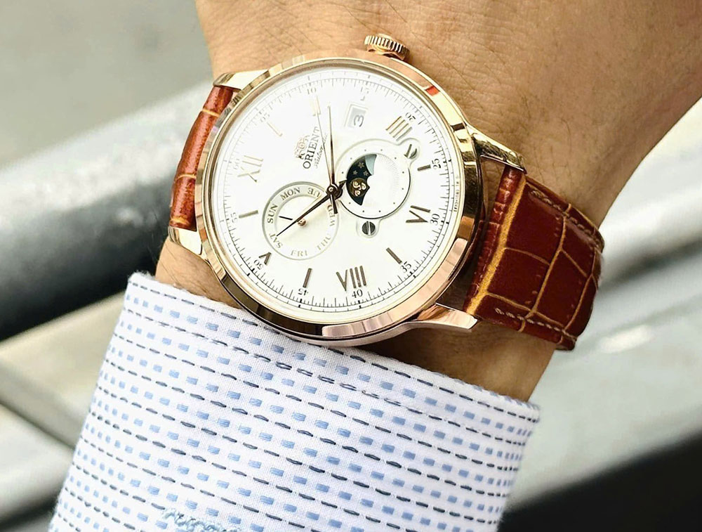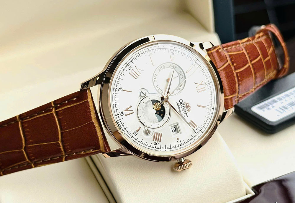ĐỒNG HỒ ORIENT NAM BAMBINO SUN AND MOON AUTOMATIC (CƠ) – 3ATM – 41.5MM RA-AK0801S30B Chiếc đồng hồ thanh lịch, cổ điển hoàn thiện bởi khung vỏ làm từ thép không gỉ mạ màu vàng hồng công nghệ PVD không phai và dây da sang trọng. Cung cấp chuyển động bởi bộ máy tự động in-house F6B24 Nhật Bản chính hãng với tầng số dao động 21.6, độ tích cót 40 giờ, chức năng lịch ngày, thứ và Sun Moon độc đáo. Sử dụng mặt kính khoáng cong độc đáo, độ chống nước 3ATM (30M).