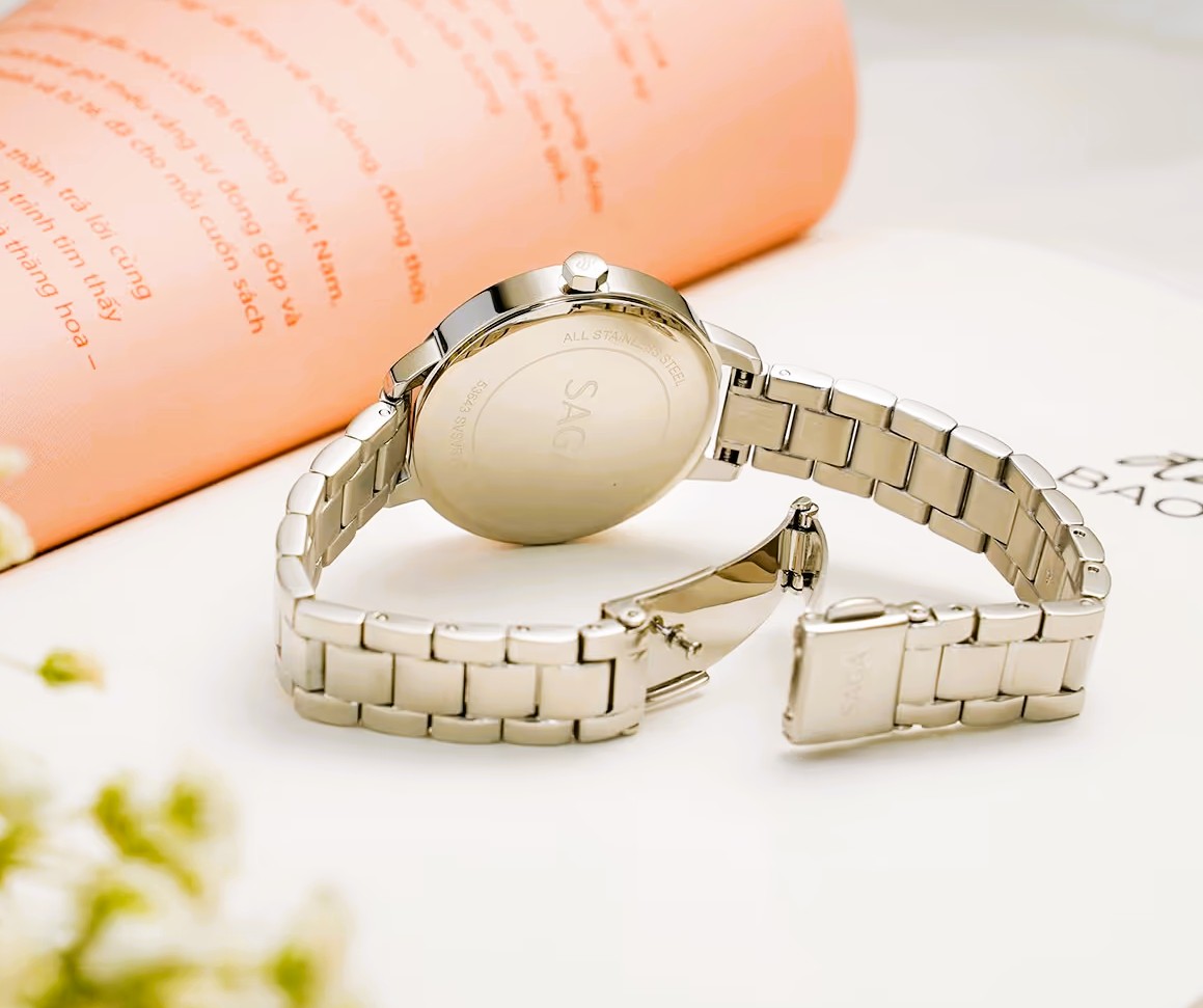 ĐỒNG HỒ SAGA – NỮ – SWAROVSKI – KÍNH KHOÁNG – 33MM – 53643-SVSVSV-2 sở hữu sắc xanh lá lộng lẫy và quyến rũ. Ngự trị trên mặt số là 4 viên đá Swarovski lấp lánh và cuốn hút. Sử dụng bộ máy quartz với năng lượng pin sử dụng lên đến 3 năm. Độ chống nước 30M (3ATM).