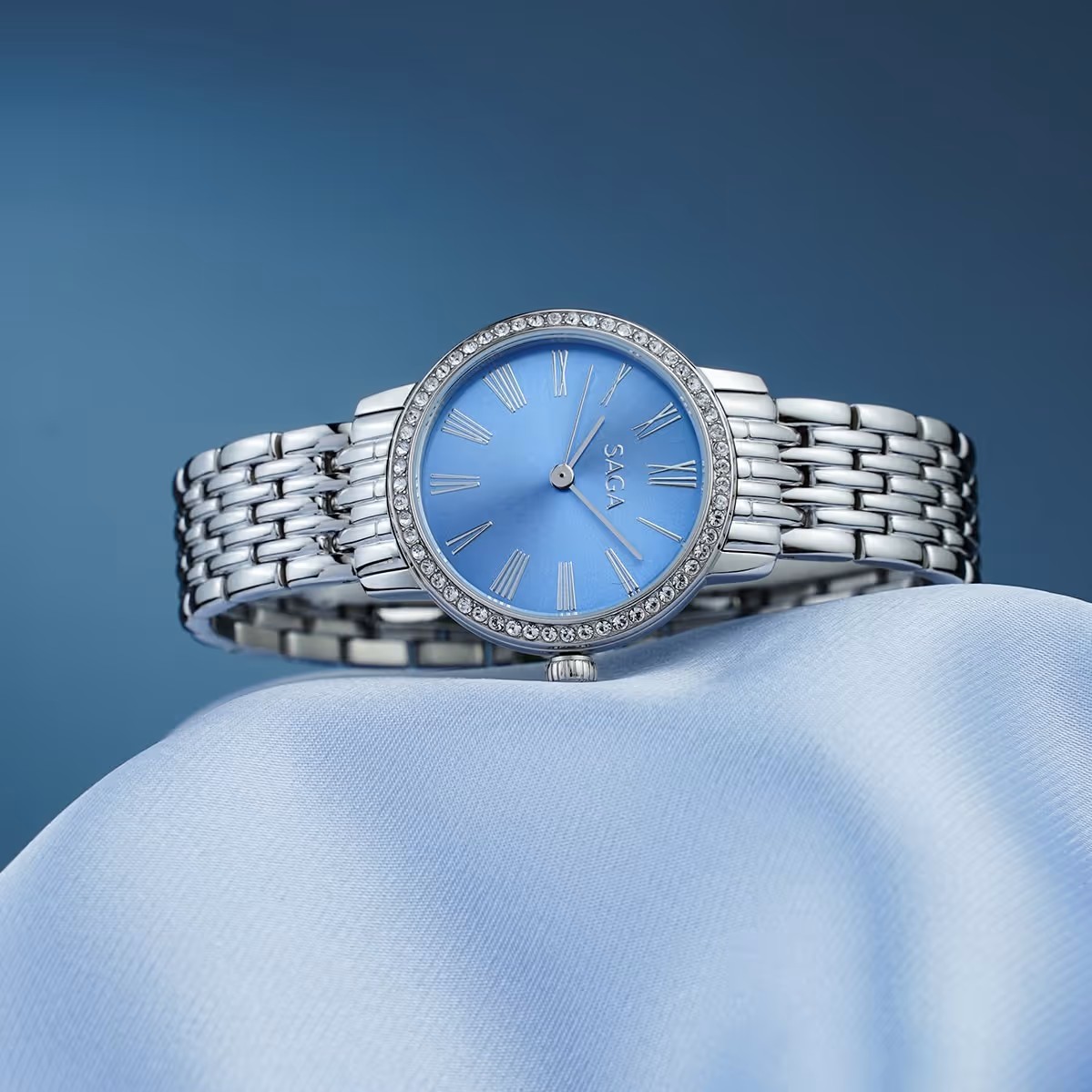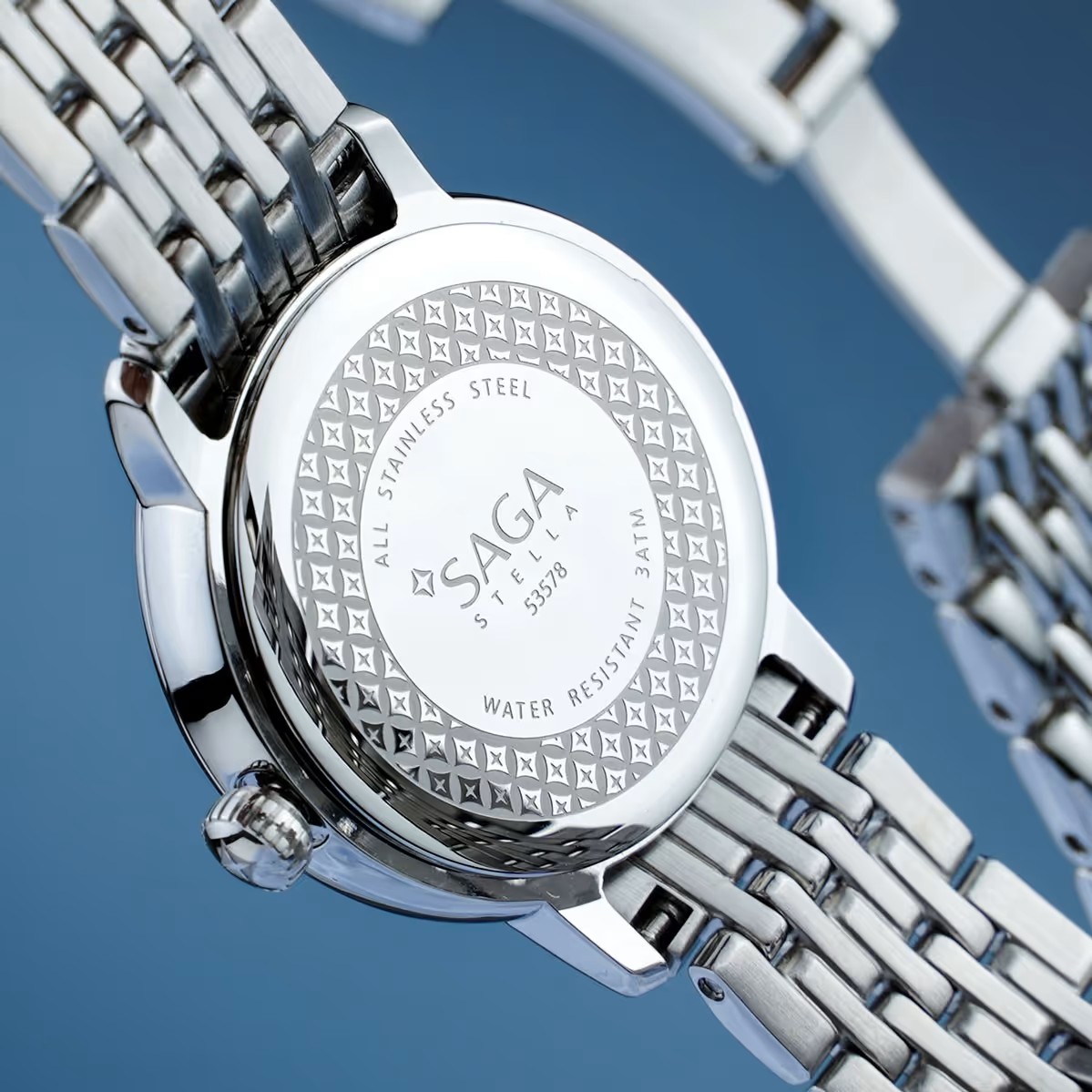 ĐỒNG HỒ SAGA – STELLA CHANCE – QUARTZ (PIN) – NỮ – KÍNH KHOÁNG – 30MM – 53578-SVBLSV-2 mang trong mình một vẻ đẹp hiện đại, nữ tính trong từng chi tiết, có thể nói đây là một mẫu đồng hồ được ra đời nhằm mục đích chinh phục mọi trái tim của chị em phụ nữ. Sử dụng bộ máy quartz với năng lượng pin sử dụng lên đến 3 năm. Độ chống nước 30M (3ATM). Điểm nhấn của chiếc đồng hồ chính hãng Saga 53578-SVBLSV-2 chính là viền đồng hồ được đính đá tự nhiên cao cấp rất sang trọng.