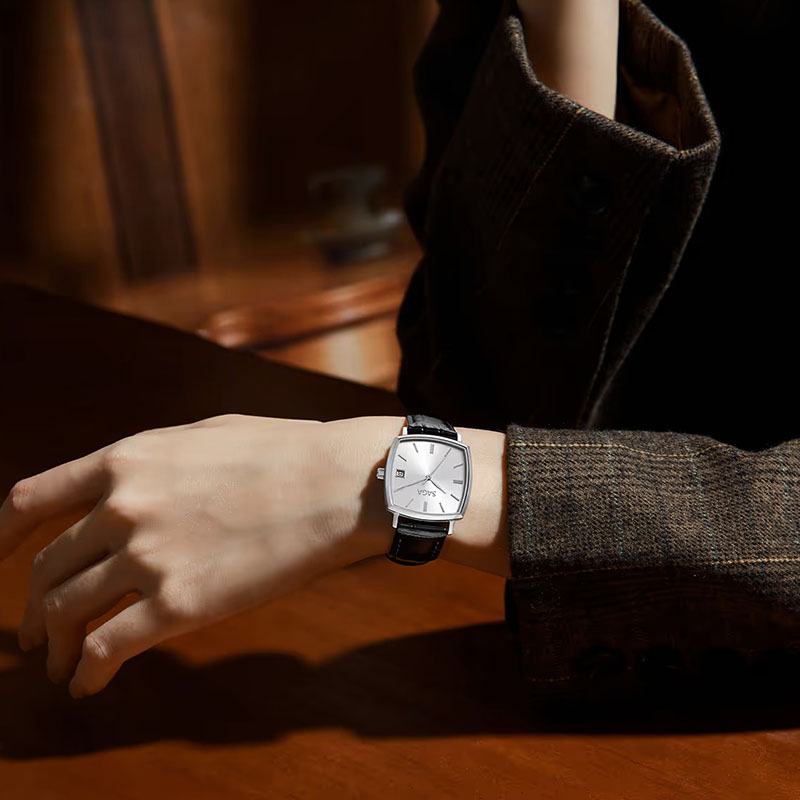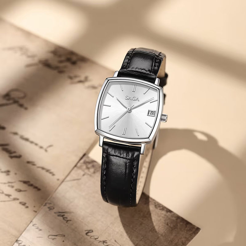 ĐỒNG HỒ SAGA STELLA NỮ 71979-SVSVBK-2 – QUARTZ – DÂY DA – KÍNH KHOÁNG – 3ATM Thiết kế mặt số hình vuông kết hợp nền màu trắng chải tia Sunburst cổ điển, sang trọng. Từng đường nét bo cong mềm mại góp phần gia tăng vẻ đẹp nữ tính, thể hiện phong cách thời trang cao cấp. Sử dụng bộ máy quartz (pin) Ronda Swiss MadeThụy Sỹ chính hãng với năng lượng pin sử dụng lên đến 3 năm. Độ chống nước 30M (3ATM).