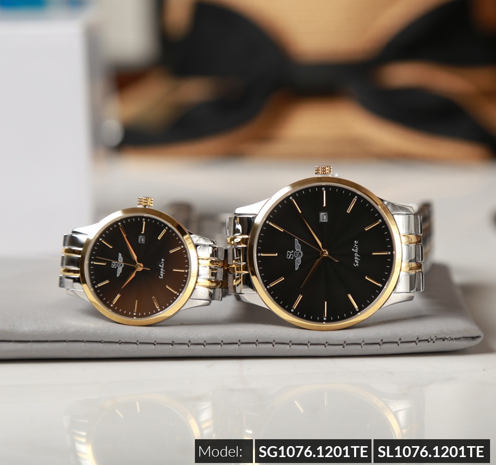 ĐỒNG HỒ SRWATCH CẶP ĐÔI SG1076.1201TE VÀ SL1076.1201TE dây, vỏ inox đúc mạ màu vàng (đờ mi) công nghệ PVD cao cấp không phai, mặt kính Sapphire Crystal nguyên khối chống trầy xước, khả năng chịu nước 50M, đồng hồ thời trang 3 kim xem giờ truyền thống và 1 lịch ngày, mặt tròn màu đen.