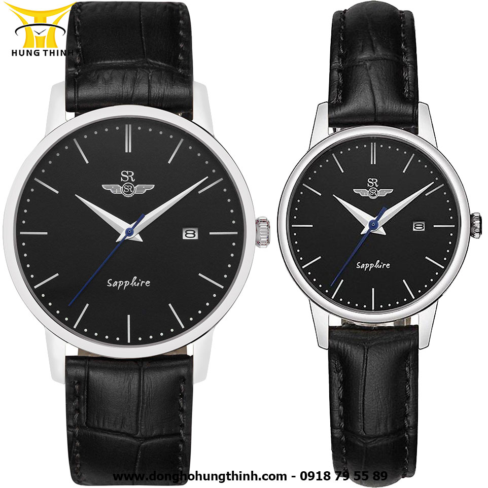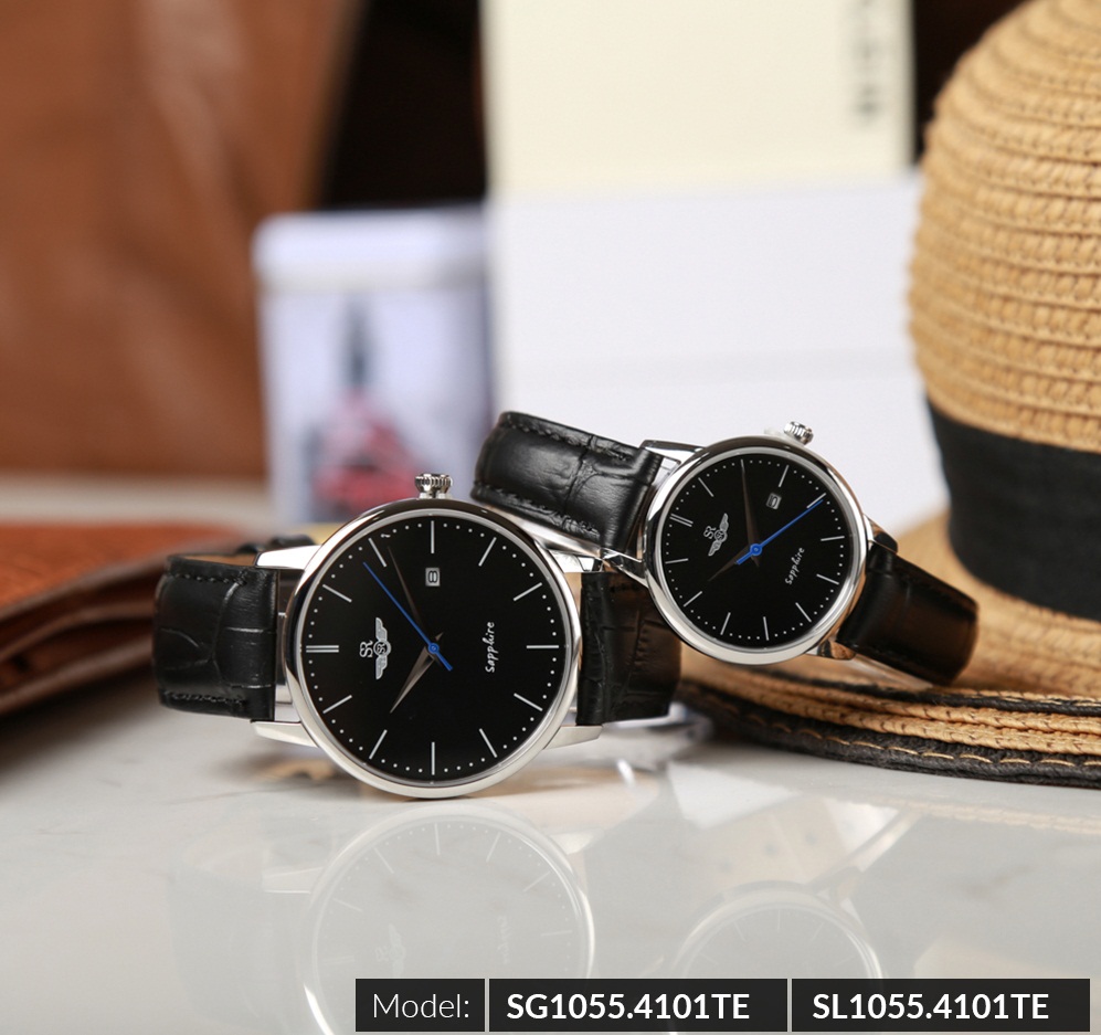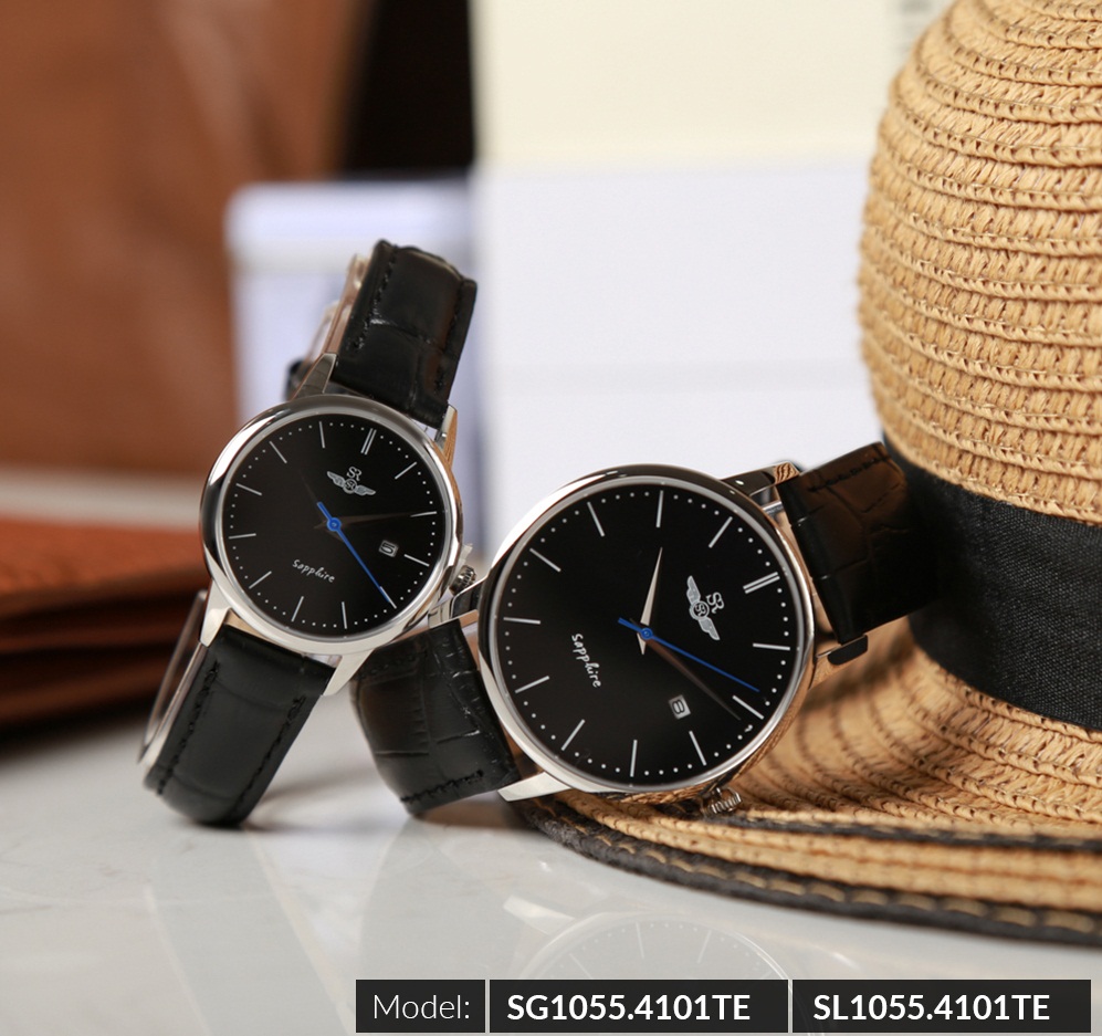 ĐÔNG HỒ SRWATCH CẶP ĐÔI SG1055.4101TE VÀ SL1055.4101TE Dây da cao cấp màu đen có vân gồm 2 lớp chống thấm, vỏ được làm từ inox đúc, mặt kính Sapphire Crystal nguyên khối chống trầy xước, khả năng chịu nước 50M, đồng hồ thời trang 3 kim xem giờ truyền thống và 1 lịch ngày, mặt tròn màu đen.