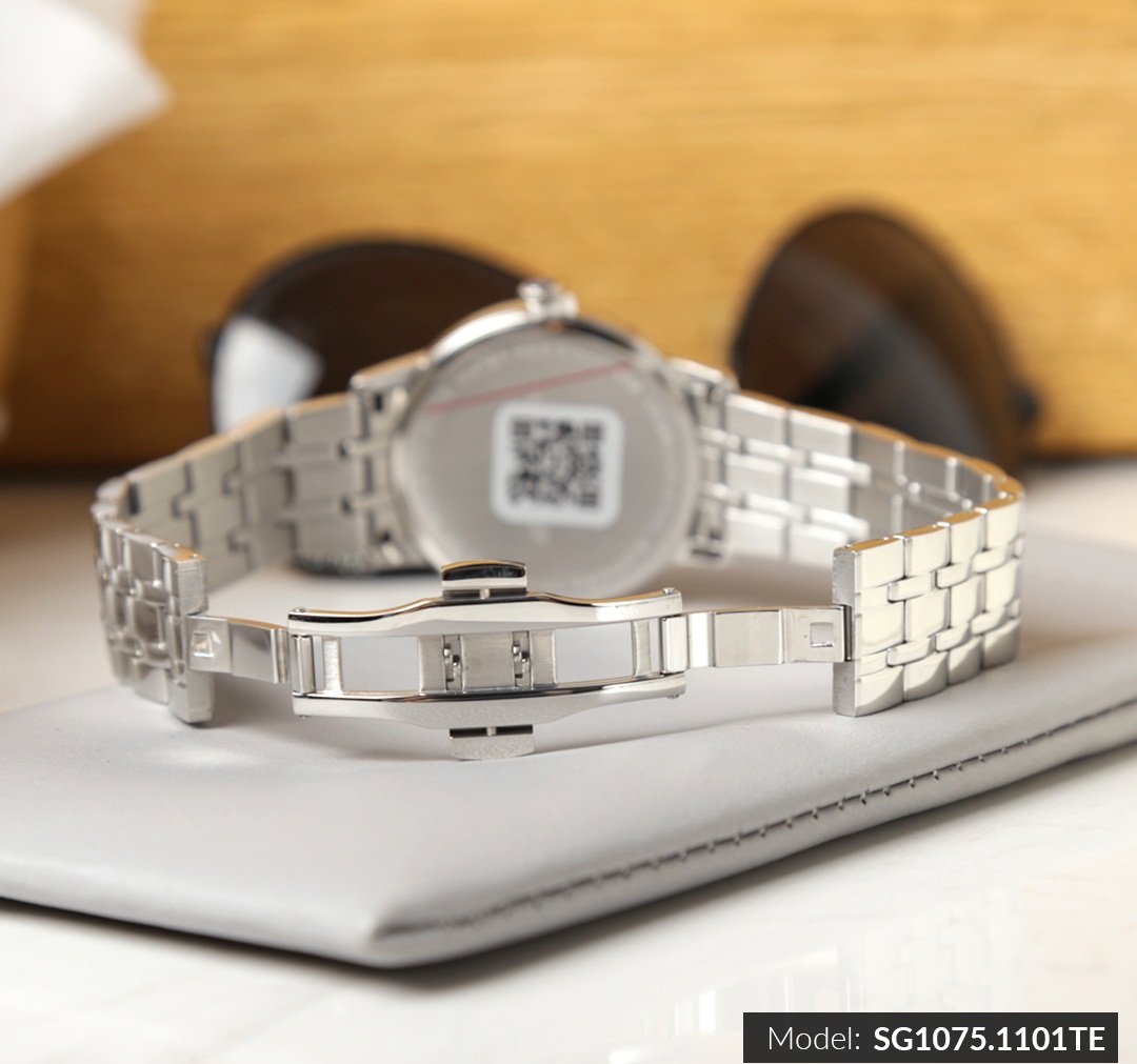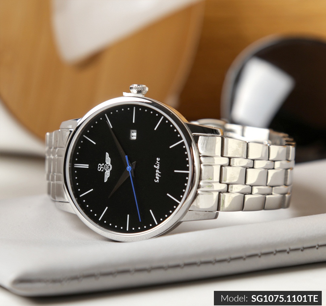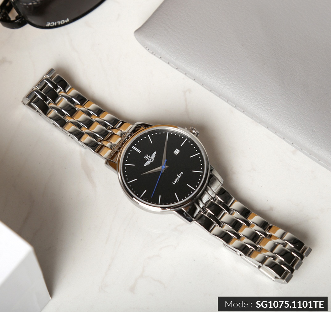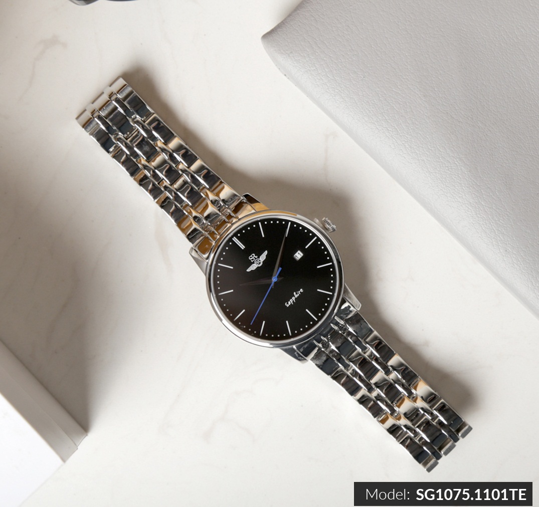 ĐỒNG HỒ SRWATCH DÂY KIM LOẠI NAM 3 KIM SG1075.1101TE dây, vỏ inox đúc, mặt kính Sapphire Crystal nguyên khối chống trầy xước, khả năng chịu nước 5ATM, đồng hồ thời trang 3 kim xem giờ truyền thống, mặt tròn màu đen.