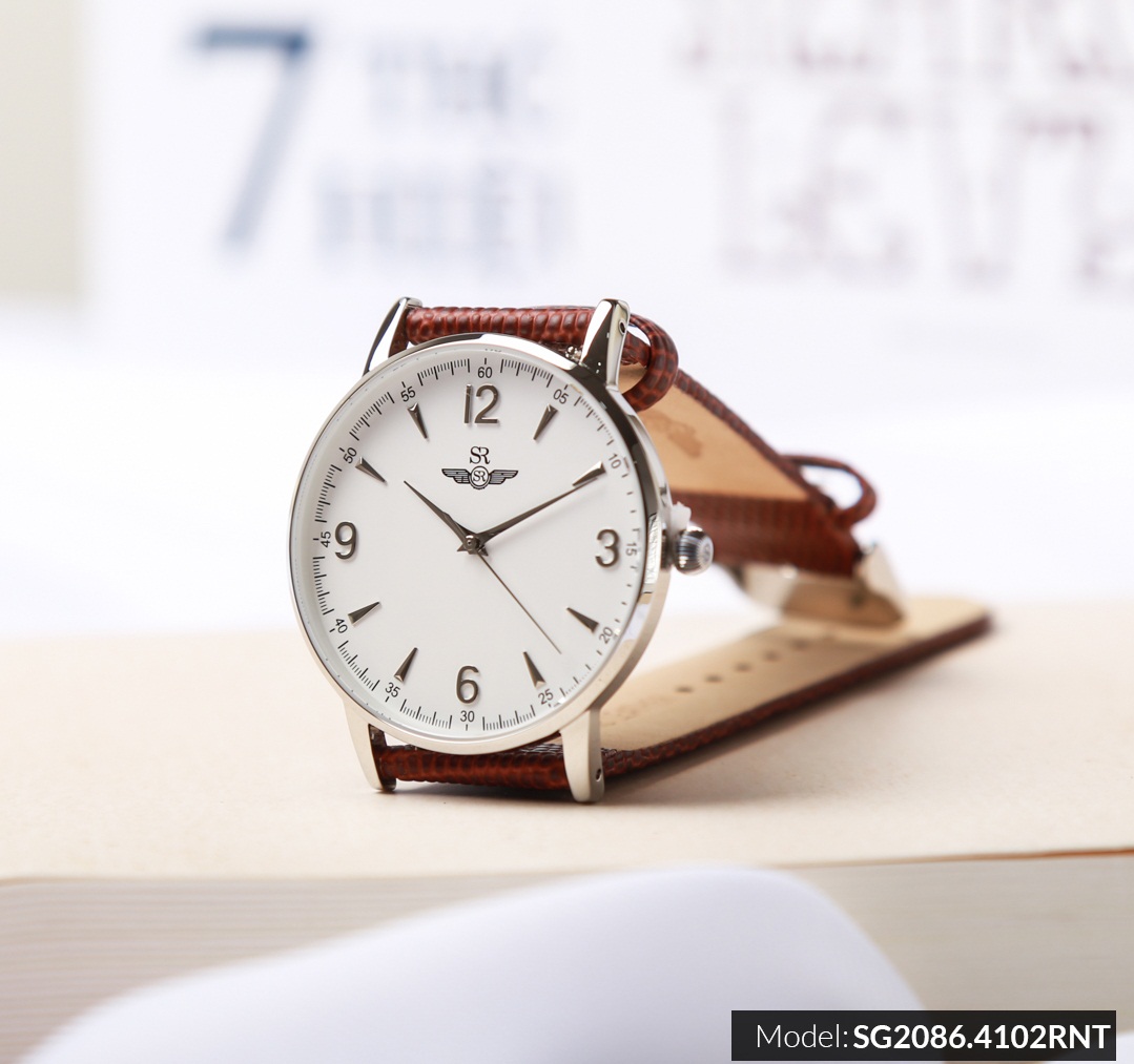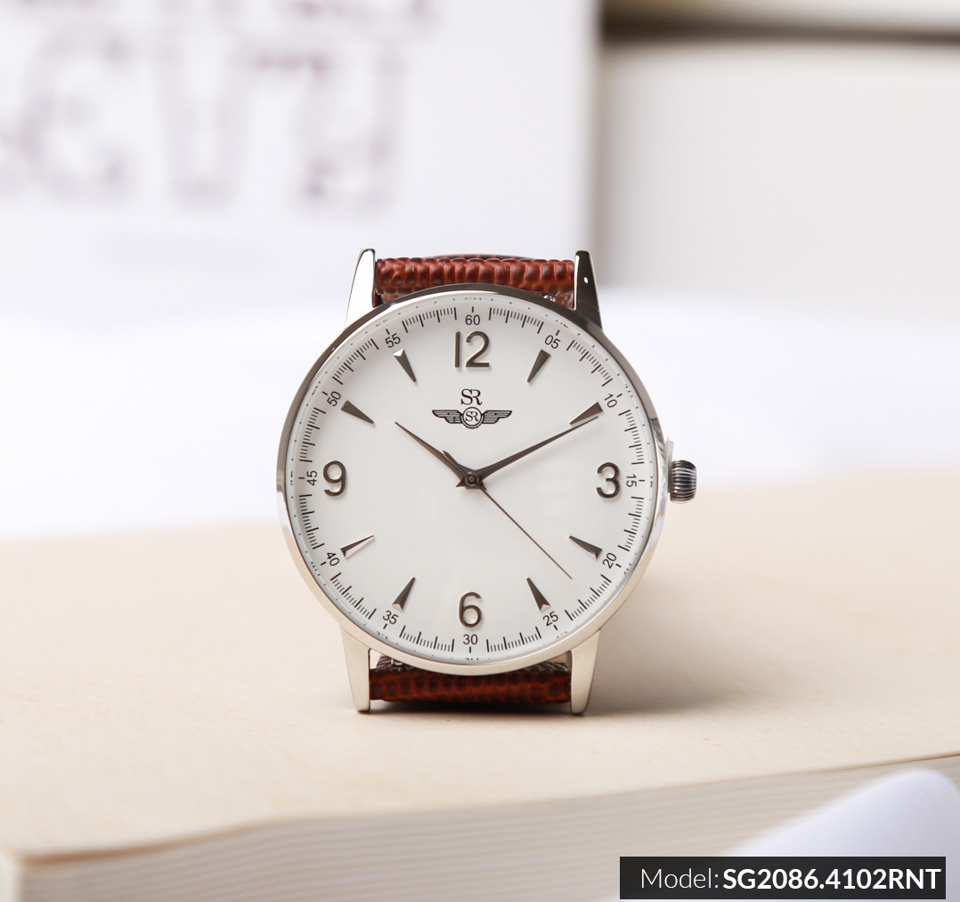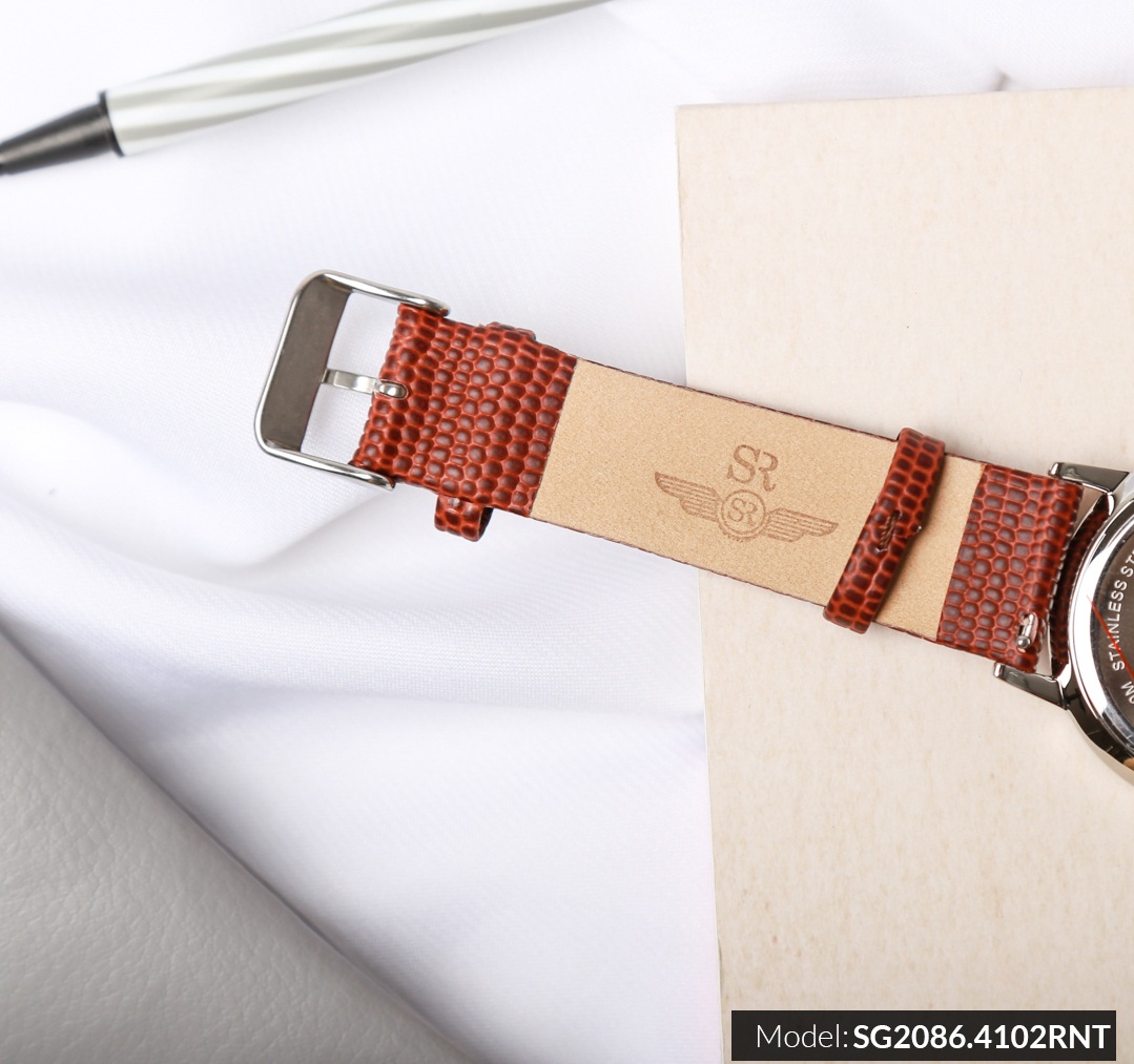 ĐỒNG HỒ SRWATCH NAM DÂY DA 3 KIM SG2086.4102RNT Dây da cao cấp vảy cá màu vàng nâu gồm 2 lớp có tác dụng chống thấm, vỏ được làm từ nguyên liệu inox, mặt kính Sapphire Crystal chống trầy xước, khả năng chịu nước dưới áp xuất 50M, đồng hồ thời trang 3 kim xem giờ truyền thống, mặt tròn màu trắng, các kim chỉ và cọc số màu bạc.