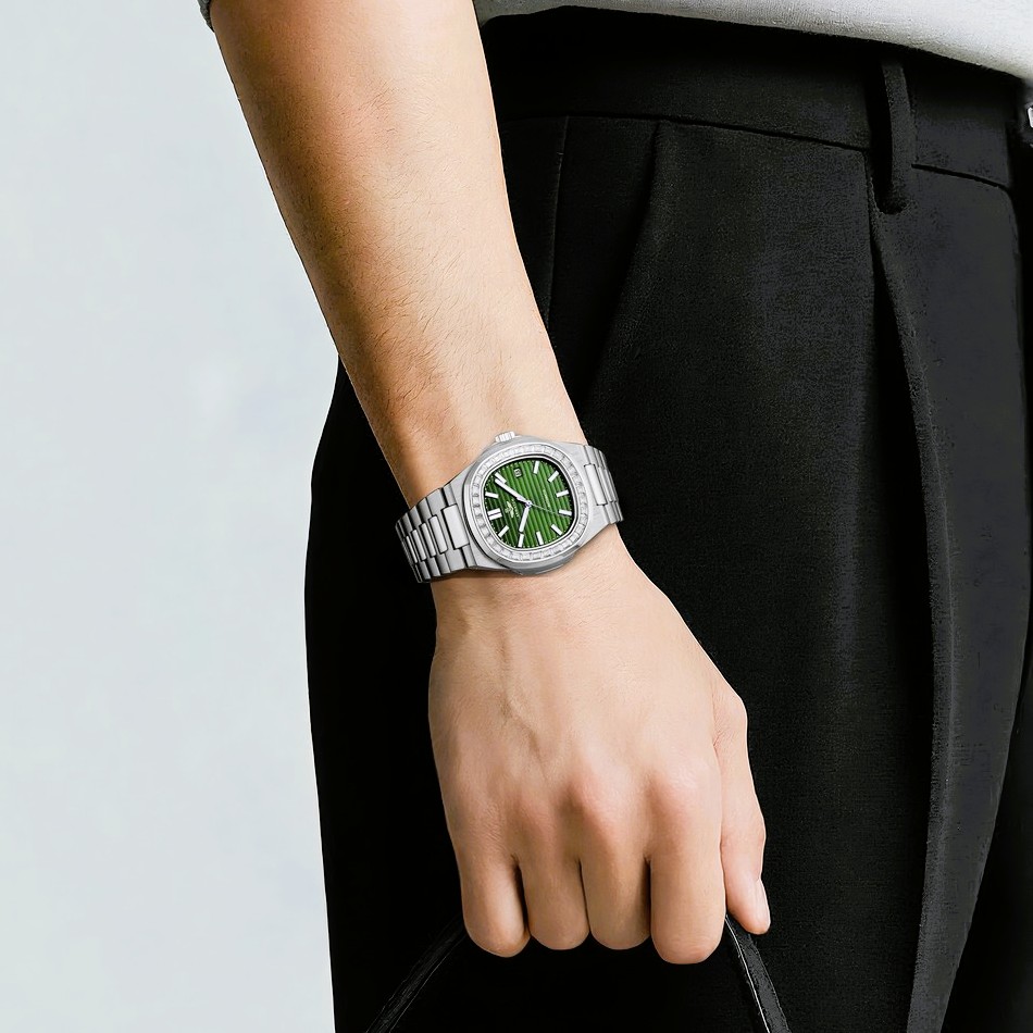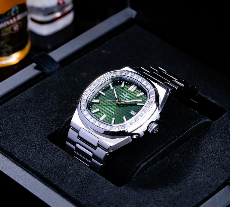 Kiểu dáng đồng hồ thời trang với thiết kế mặt oval, mặt số màu xanh lá, được bao quanh bời viền đá lấp lánh tạo cho chiếc đồng hồ sự nổi bật và sang trọng vượt bật. Sử dụng bộ máy tự động Nhật Bản chính hãng rất bền bỉ, mặt kính Sapphire nguyên khối chống trầy và độ chống nước 5ATM giúp người đeo thuận tiện trong các hoạt động hằng ngày.