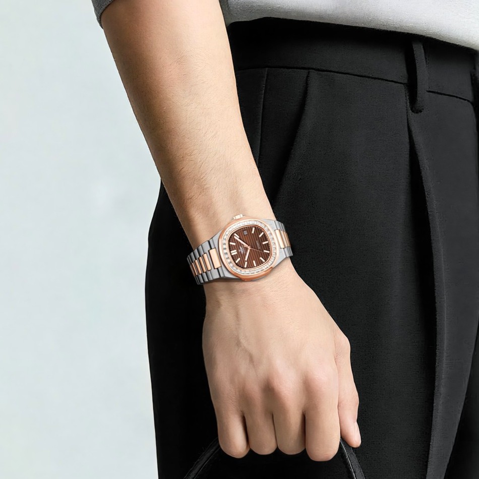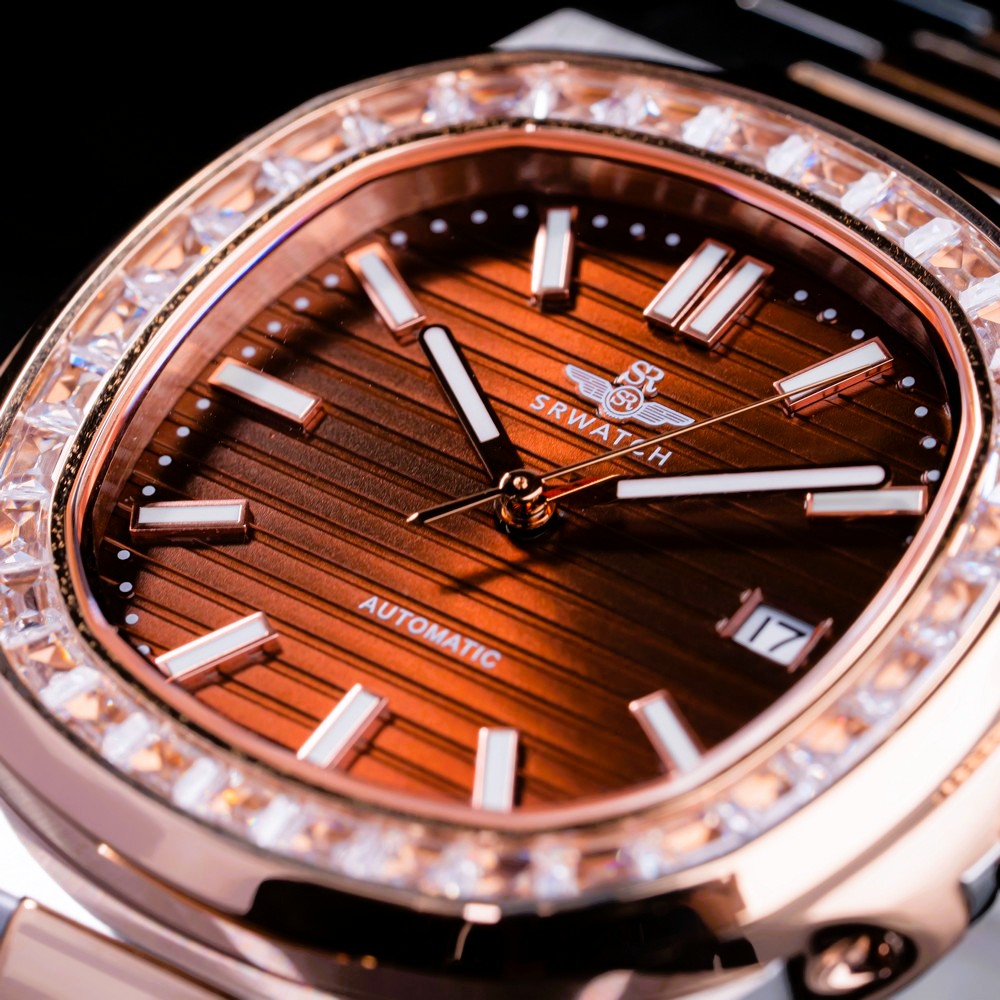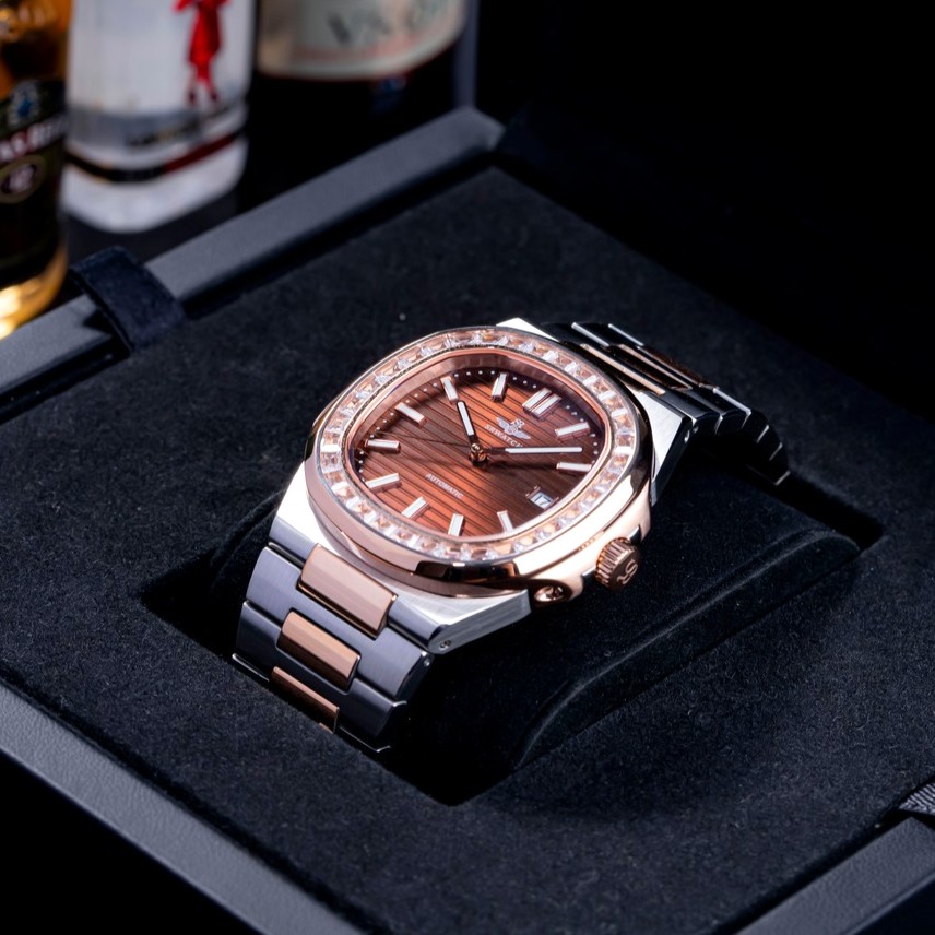 Kiểu dáng đồng hồ thời trang với thiết kế mặt oval, mặt số màu nâu, được bao quanh bời viền đá lấp lánh kết hợp với dây Demi màu vàng hồng tạo cho chiếc đồng hồ sự nổi bật và sang trọng vượt bật. Sử dụng bộ máy tự động Nhật Bản chính hãng rất bền bỉ, mặt kính Sapphire nguyên khối chống trầy và độ chống nước 5ATM giúp người đeo thuận tiện trong các hoạt động hằng ngày.
