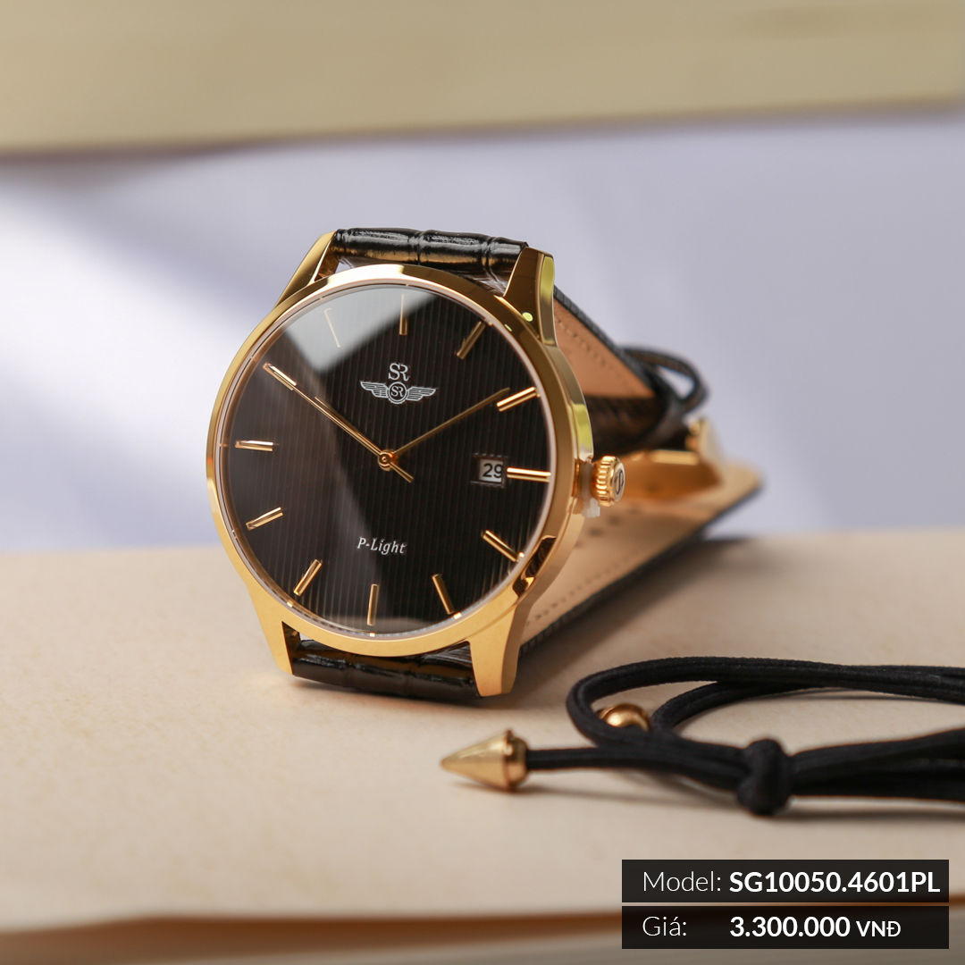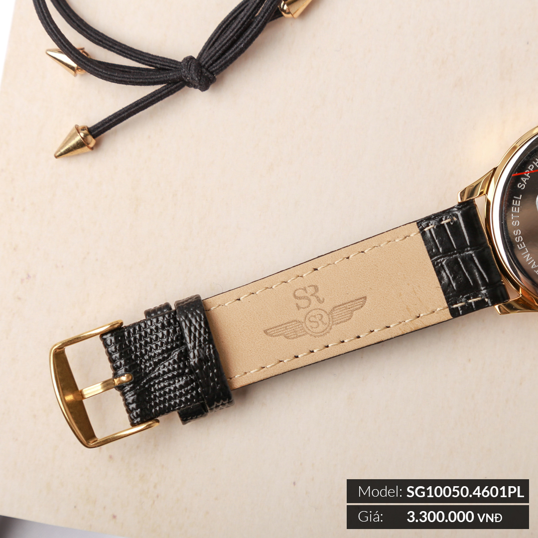 Đồng hồ cao cấp chính hãng SUNRISE DÂY DA NAM 3 KIM P-LIGHT SG10050.4601PL Sử dụng bộ máy Nhật Bản với công nghệ SOLAR hấp thụ năng lượng ánh sáng không cần thay pin, vỏ inox đúc mạ màu vàng công nghệ PVD cao cấp không phai, mặt kính sapphire nguyên khối chống trầy xước. Đồng hồ 3 kim xem giờ truyền thống và 1 lịch ngày.