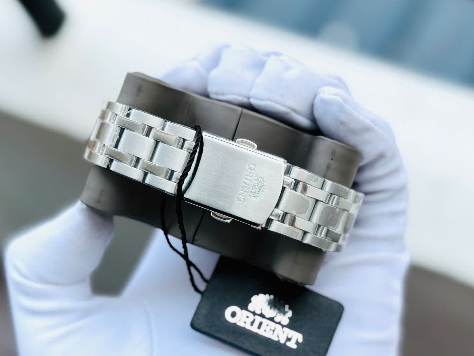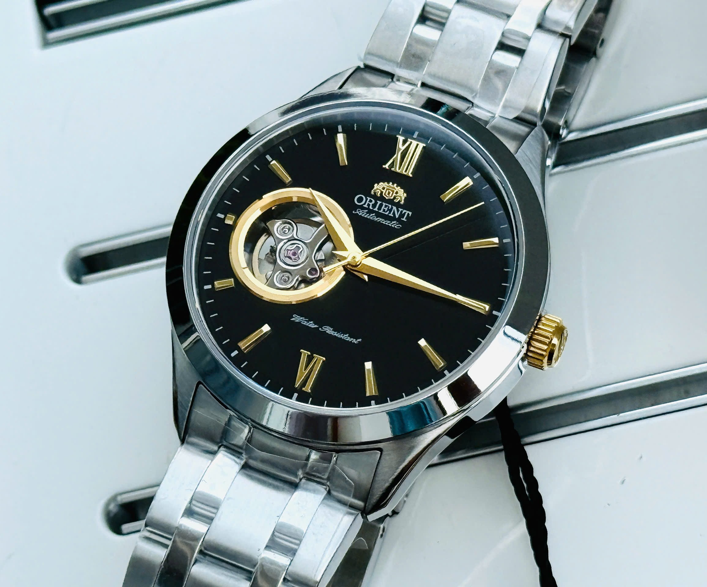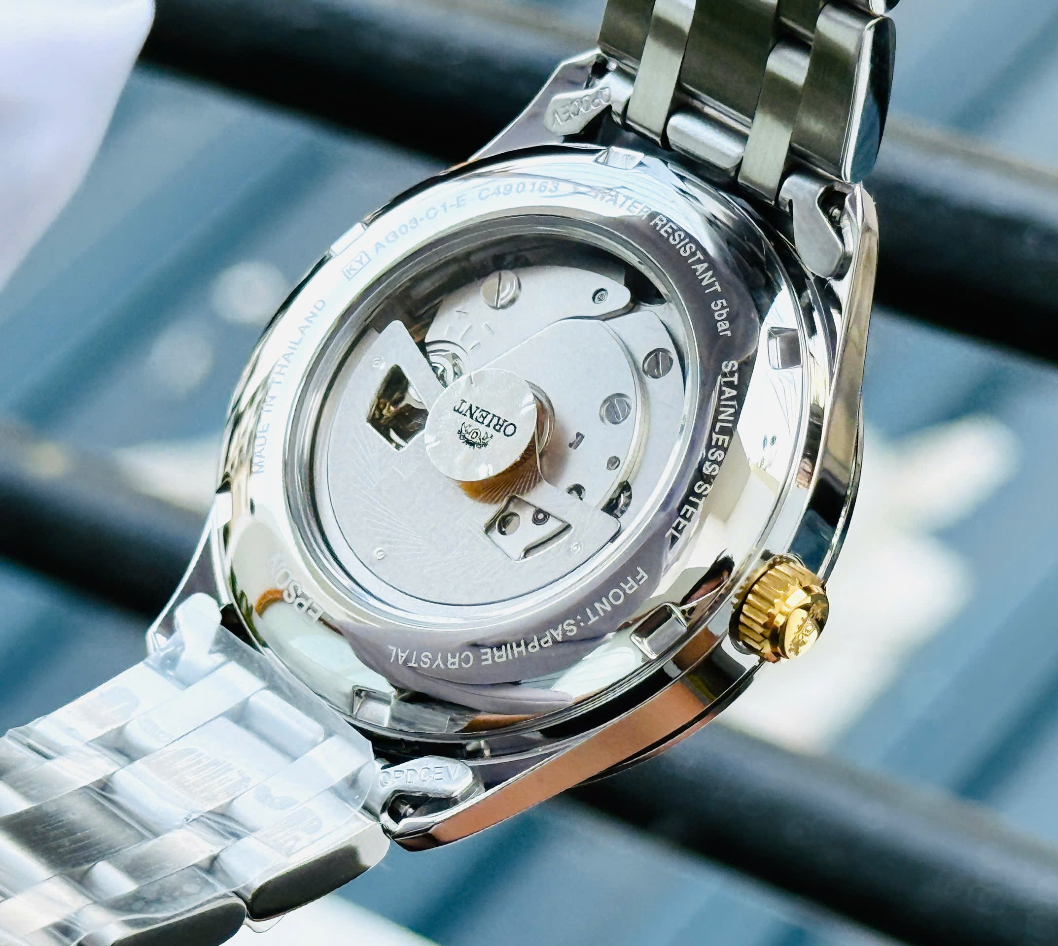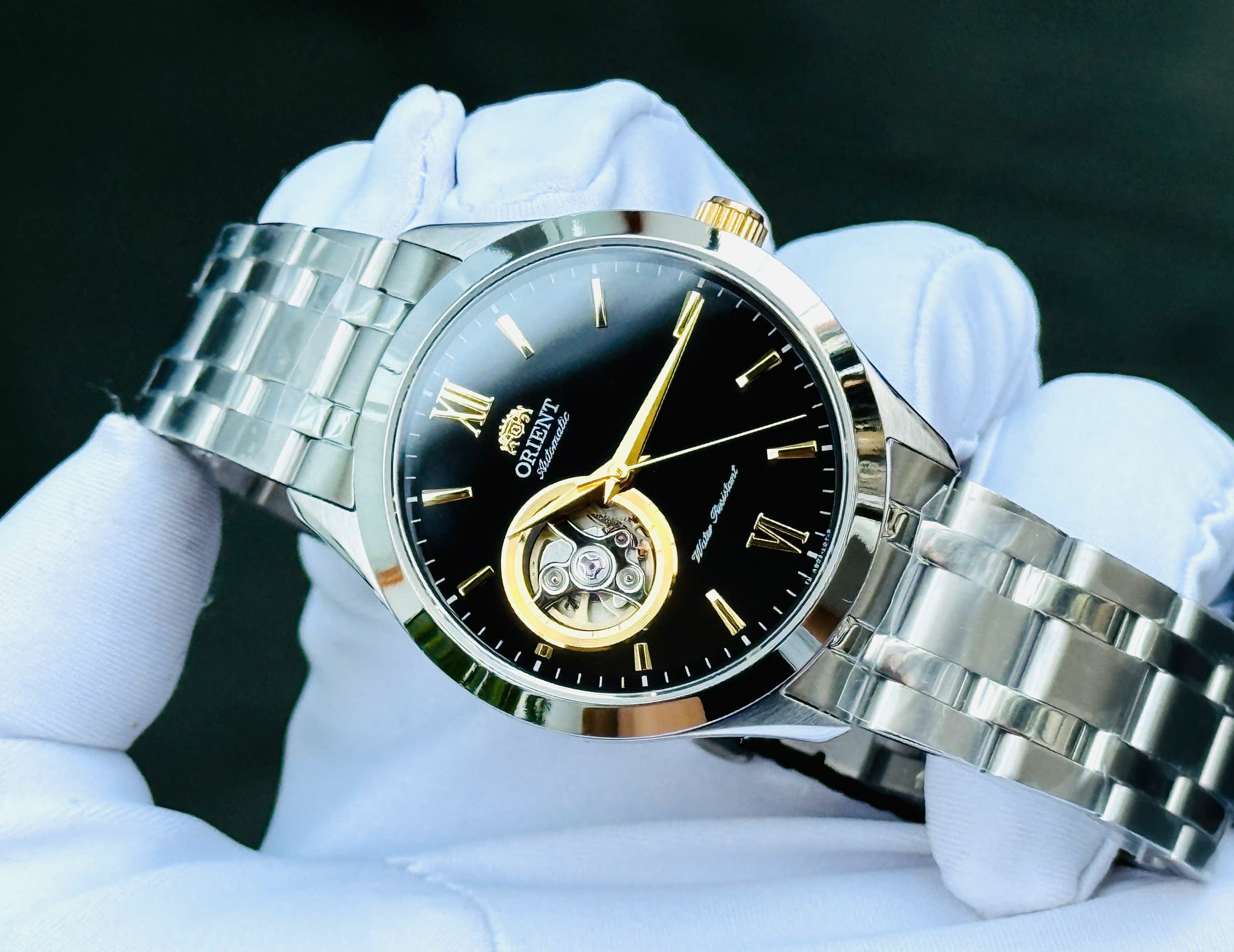Đồng hồ chính hãng Nhật Bản ORIENT NAM AUTOMATIC FAG03002B0 DÂY KIM LOẠI – SAPHIRE – 38.5MM sử dụng công nghệ máy tự động Nhật Bản (Japan automatic movement). Dây vỏ inox đúc, kính sapphire nguyên khối chống trầy xước cả mặt trên và mặt đấy đồng hồ, để lộ bộ phận máy hoạt động bên trong nhìn sang trọng và đẳng cấp. Kiểu dáng đồng hồ thời trang với 3 kim quay hiển thị giờ, phút, giây truyền thống, mặt đồng hồ màu đen kết hợp với các chi tiết như kim, cọc số, núm vặn vv… mạ màu vàng không phai tạo sự quý phái, thanh lịch.