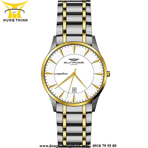 Đồng hồ đeo tay nam cao cấp chính hãng SUNRISE BA KIM SG7331.1202 xuất xứ thương hiệu Nhật Bản, kiểu dáng đồng hồ thời trang dây vỏ Inox mạ màu vàng (đờ mi) công nghệ cao không phai, kính sapphire nguyên khối chống trầy xước, mặt đồng hồ màu trắng bóng, kim, cọc số và logo nhãn hiệu mạ màu vàng sang trong. Đồng hồ 3 kim hiển thị giờ, phút, giây truyền thống và 1 lịch ngày.